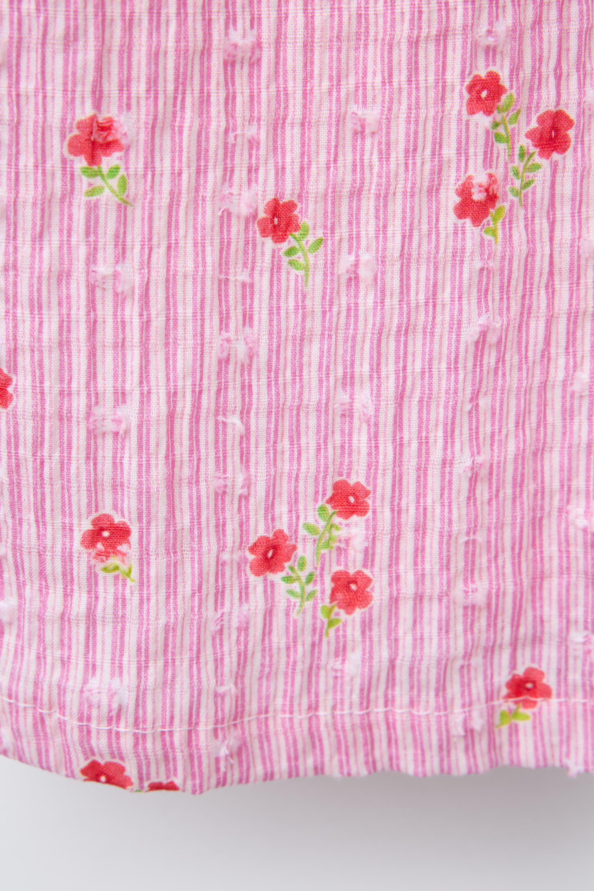 Düz yakalı ve askılı kısa tulum. İşlemeli dantel detaylı fırfır aplikeli. Çiçek baskılı.