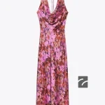 پیراهن میدی با یقه دراپه و بندهای قابل تنظیم. جزئیات فلزی با سنگهای تزئینی روی بندها. قسمت پشتی یقه دراپه و بندهای قابل تنظیم با مروارید.