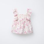 تاپ شيفلی با یقه صاف و آستینهای فرفری. دارای بسته شدن دکمهای در پشت. طرح گلدار.
