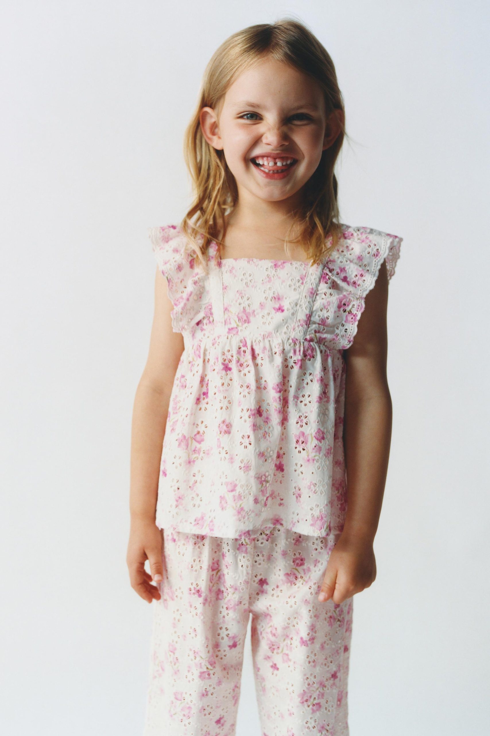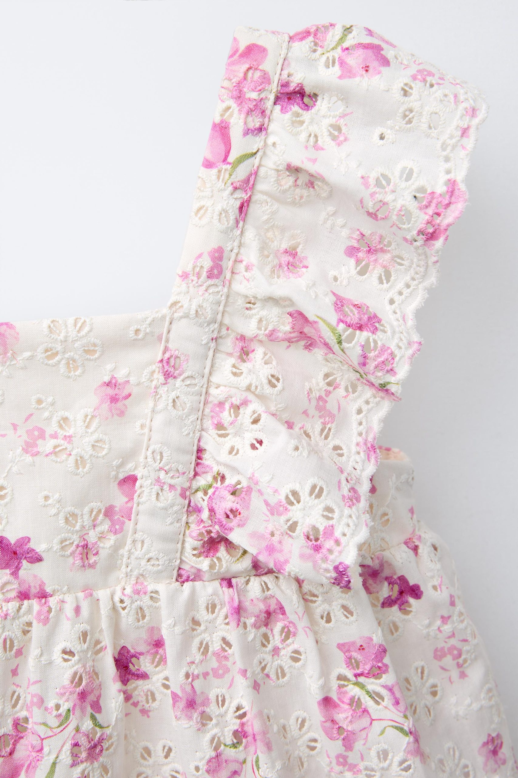 Düz yakalı ve fırfır aplikeli askılı shiffly kumaş top. Arkadan düğme kapamalı. Çiçek desenli.