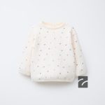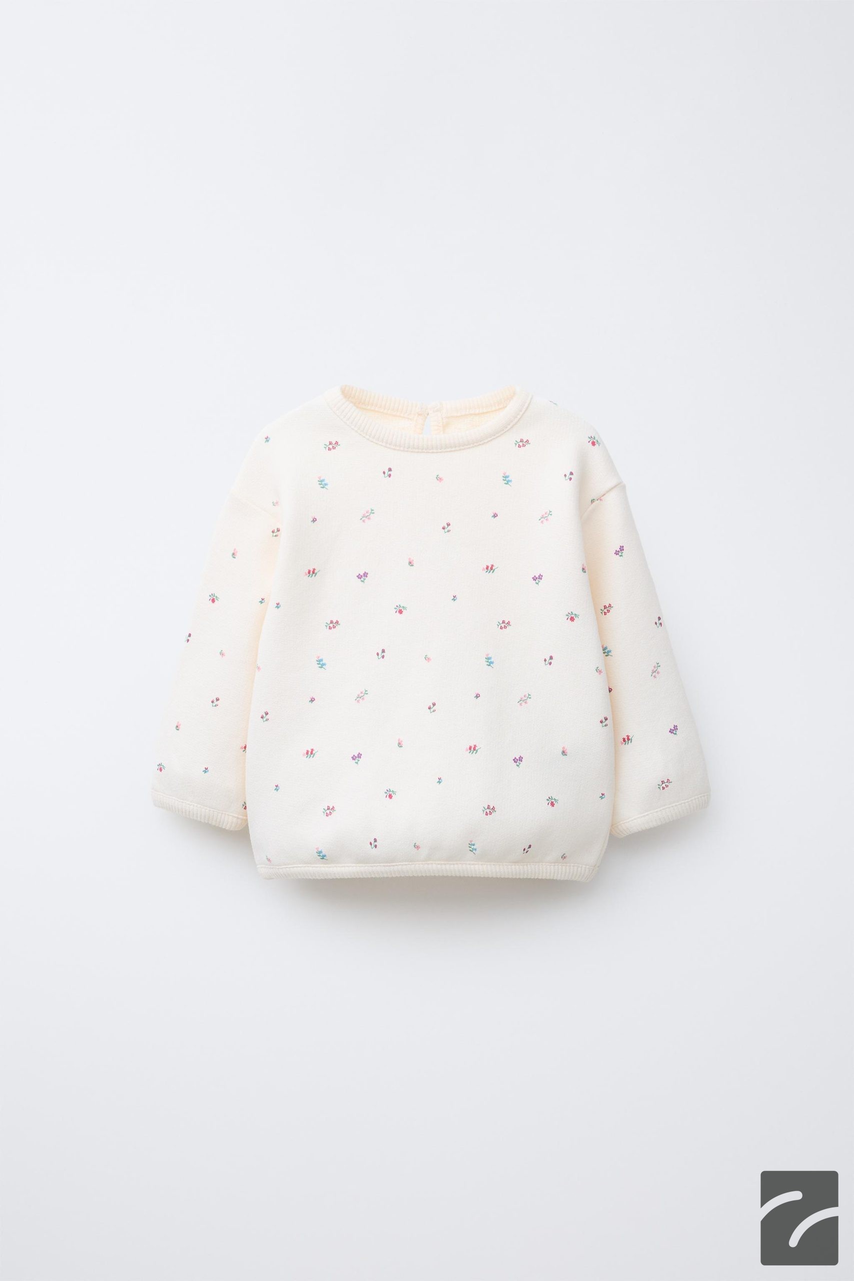 سویشرت آستین بلند یقه گرد. دارای سطوح زنده با نوارهای راه‌راه. بسته شدن با دکمه و چاک در پشت. طرح گل‌دار. تهیه شده از ۱۰۰% پارچه پنبه‌ای.