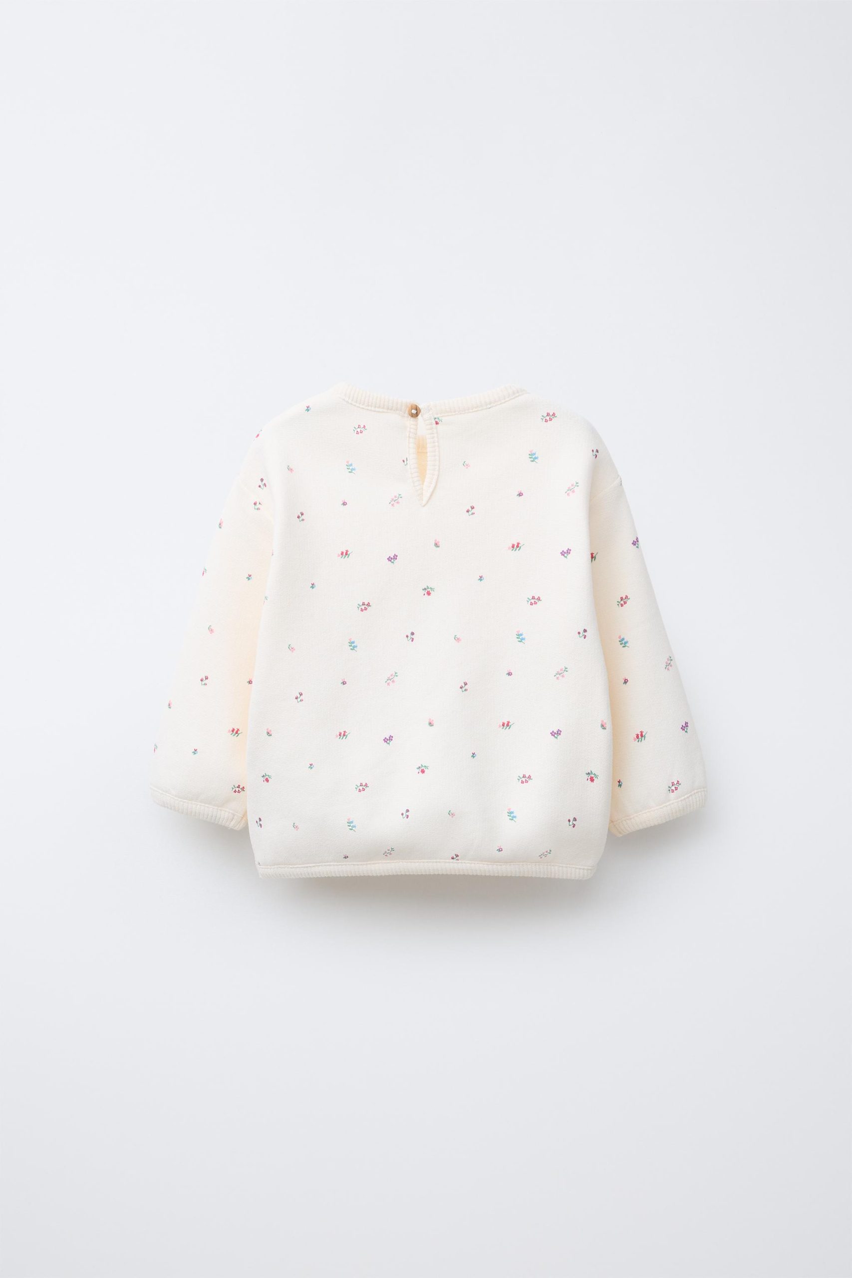Bisiklet yaka, uzun kollu sweatshirt. Fitilli şeritli canlı yüzeyler. Arkada düğmeli, yırtmaçlı kapama. Çiçek baskılı. %100 pamuklu kumaş.