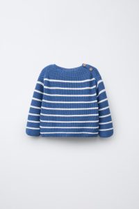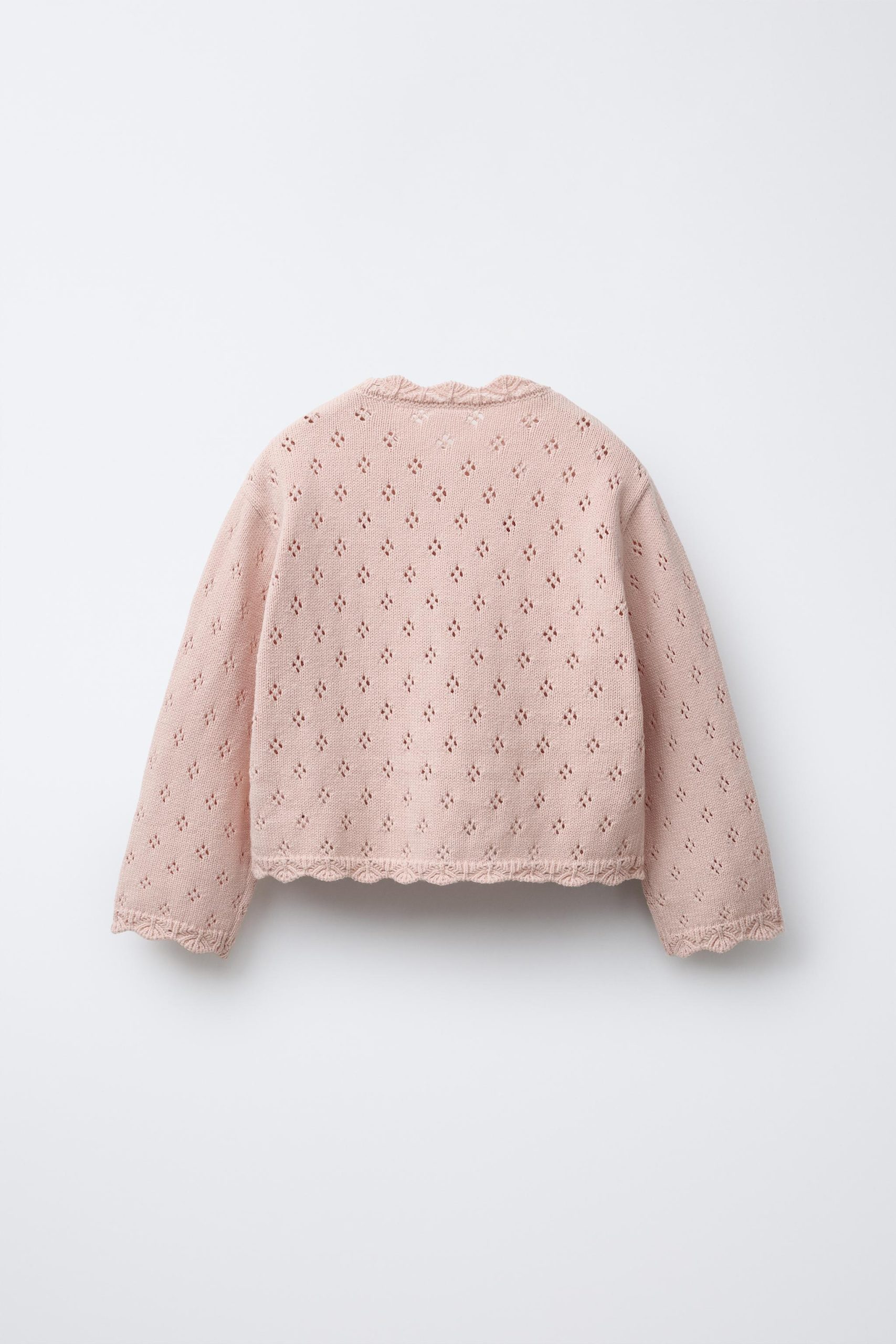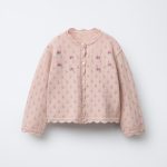 ژاکت با یقه دکمهدار و آستینهای بلند با بافت. قسمت جلو دارای جزئیات گلدوزی شده با طرح گل است.