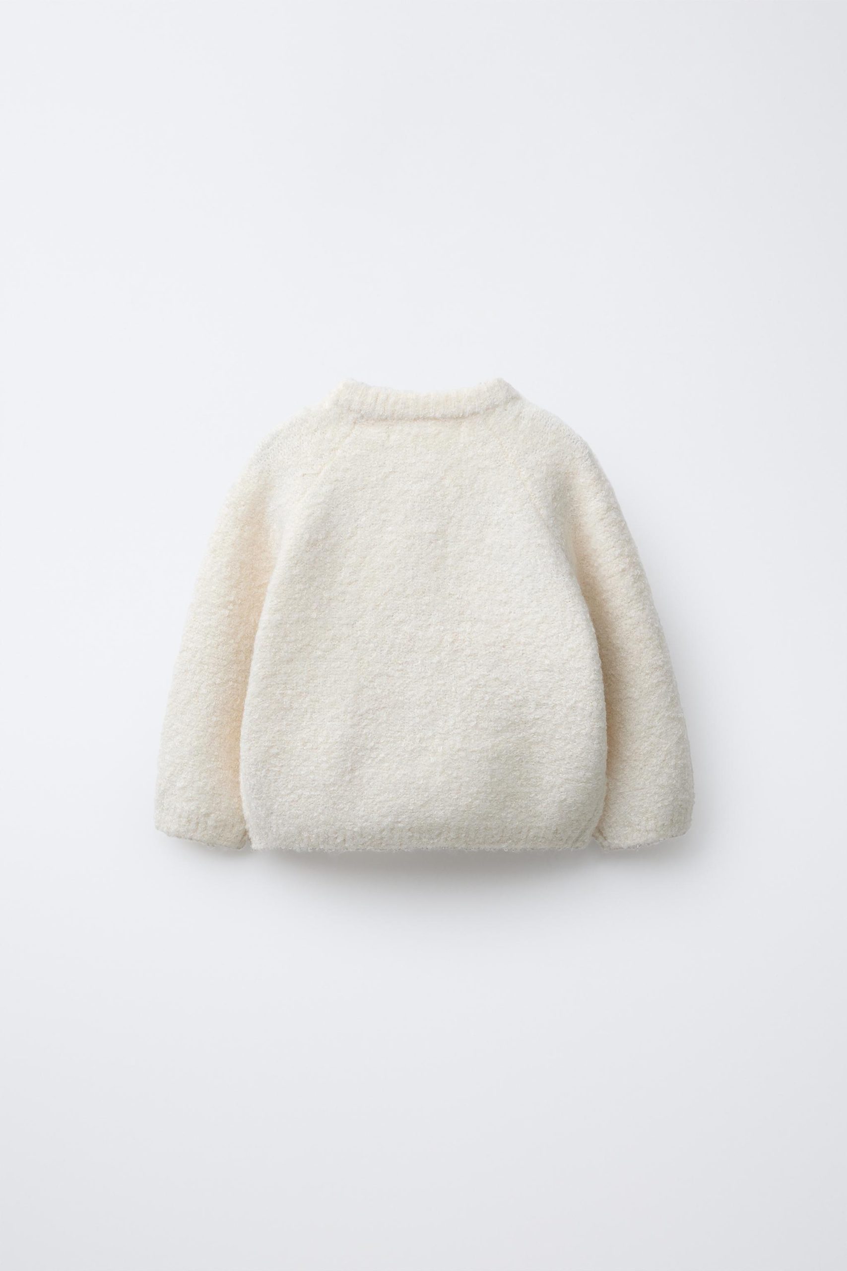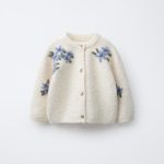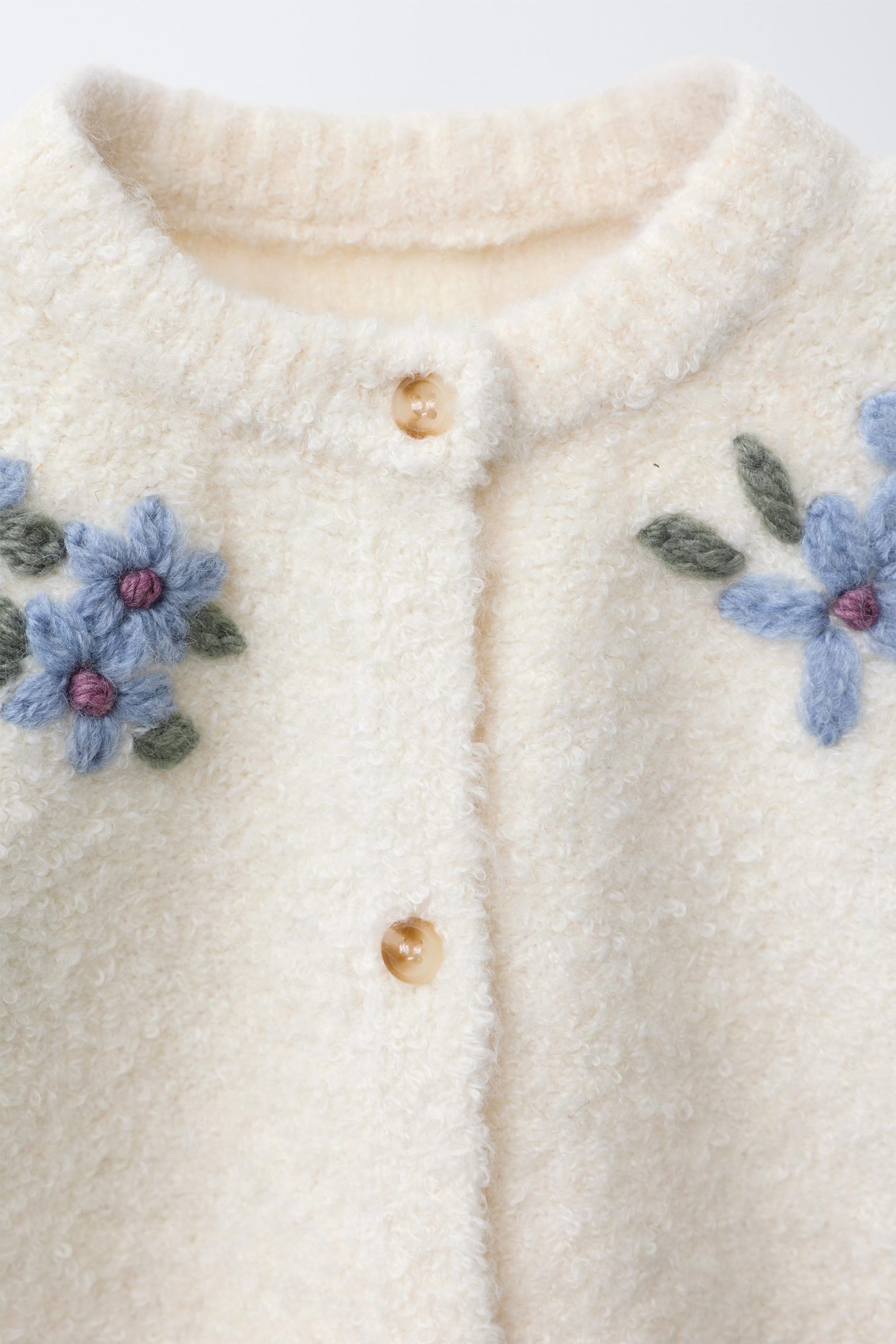 Bisiklet yaka, uzun kollu örgü hırka. Önü düğme iliklemeli. Göğüs kısmında kontrast renkli çiçek işlemeleri.