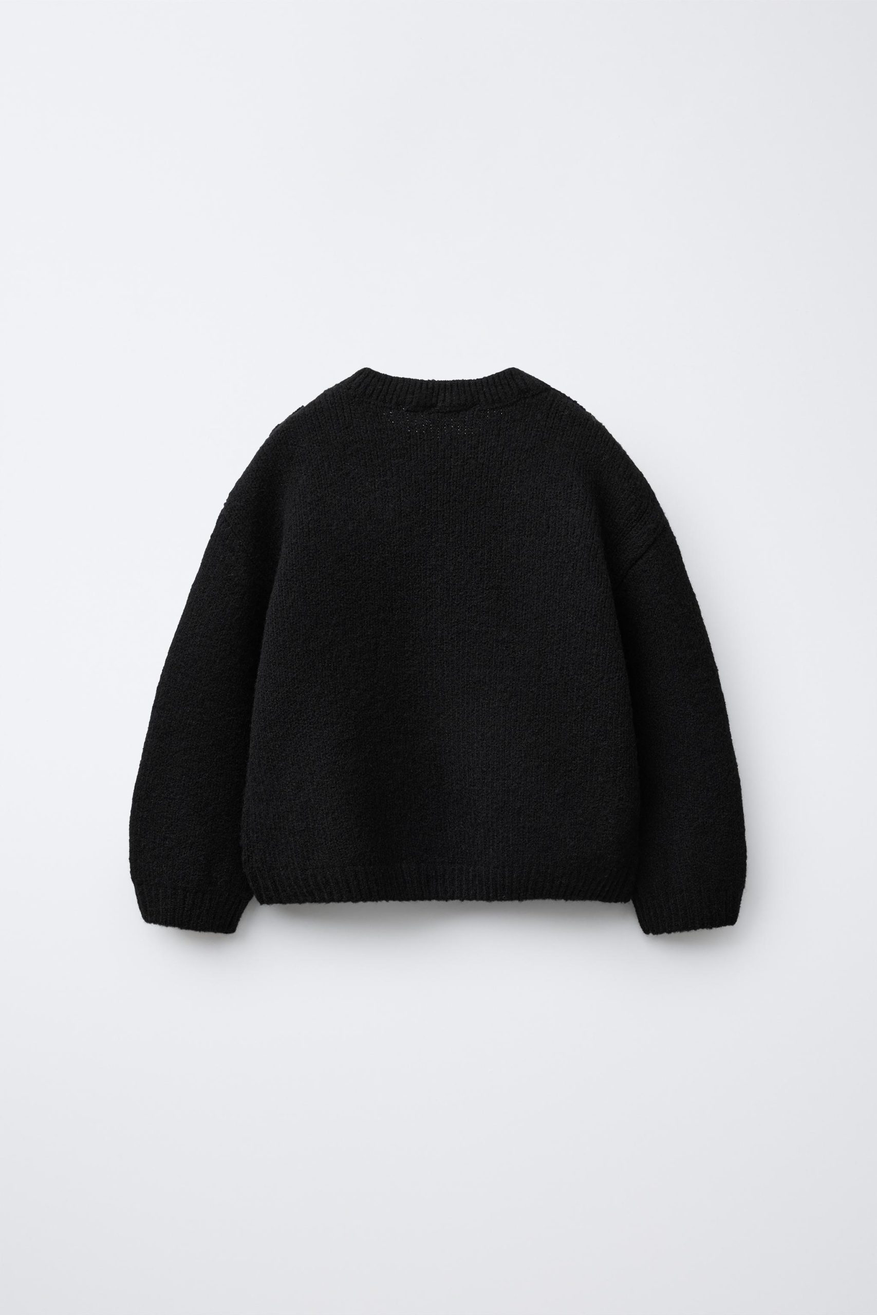 ژاکت با یقه گرد و آستین بلند از جنس بافتنی. در قسمت جلو، تزئینات گلدار وجود دارد.
