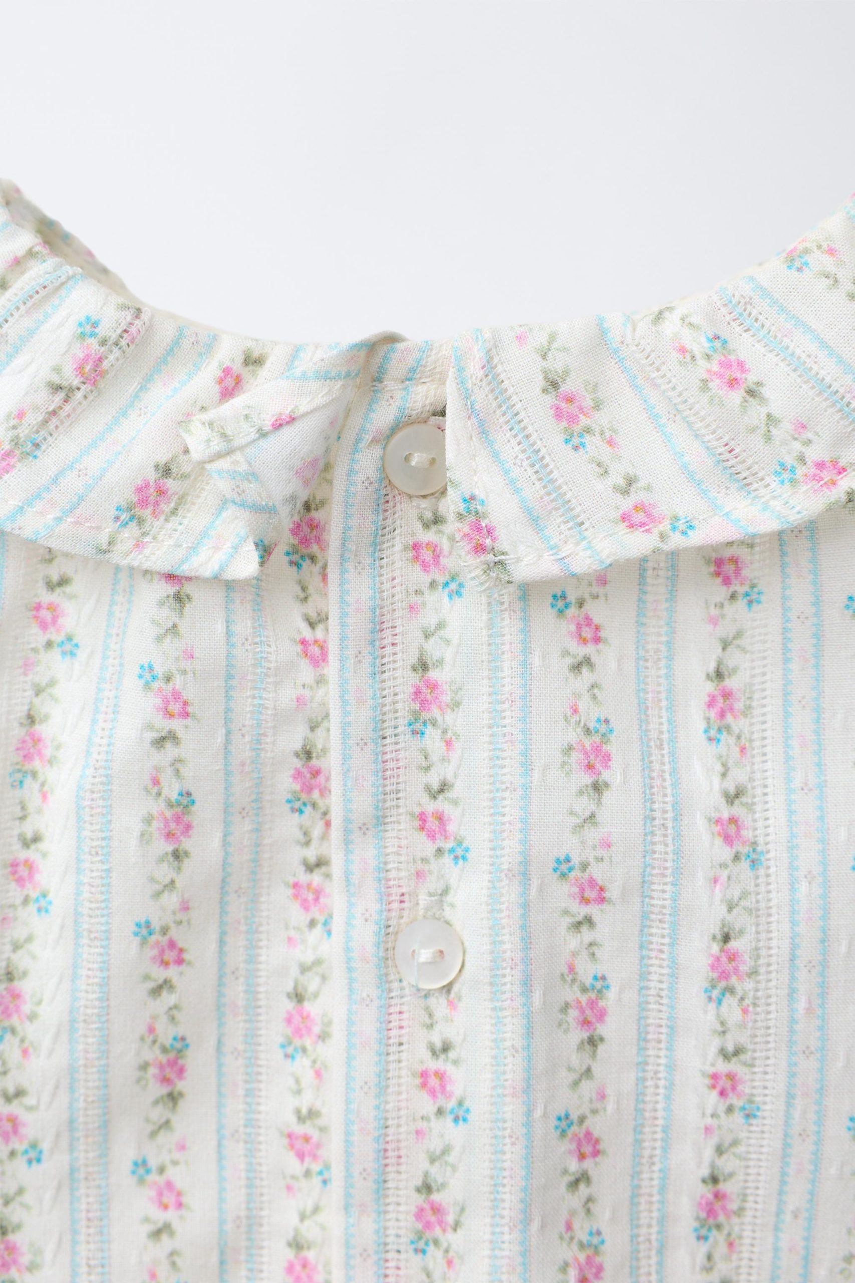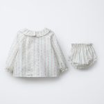 İki parçalı takım. Bebe yakalı ve lastikli uzun kollu gömlek. Arkadan düğme kapamalı. Göğüs kısmında pile detayı. Lastikli belli külot.