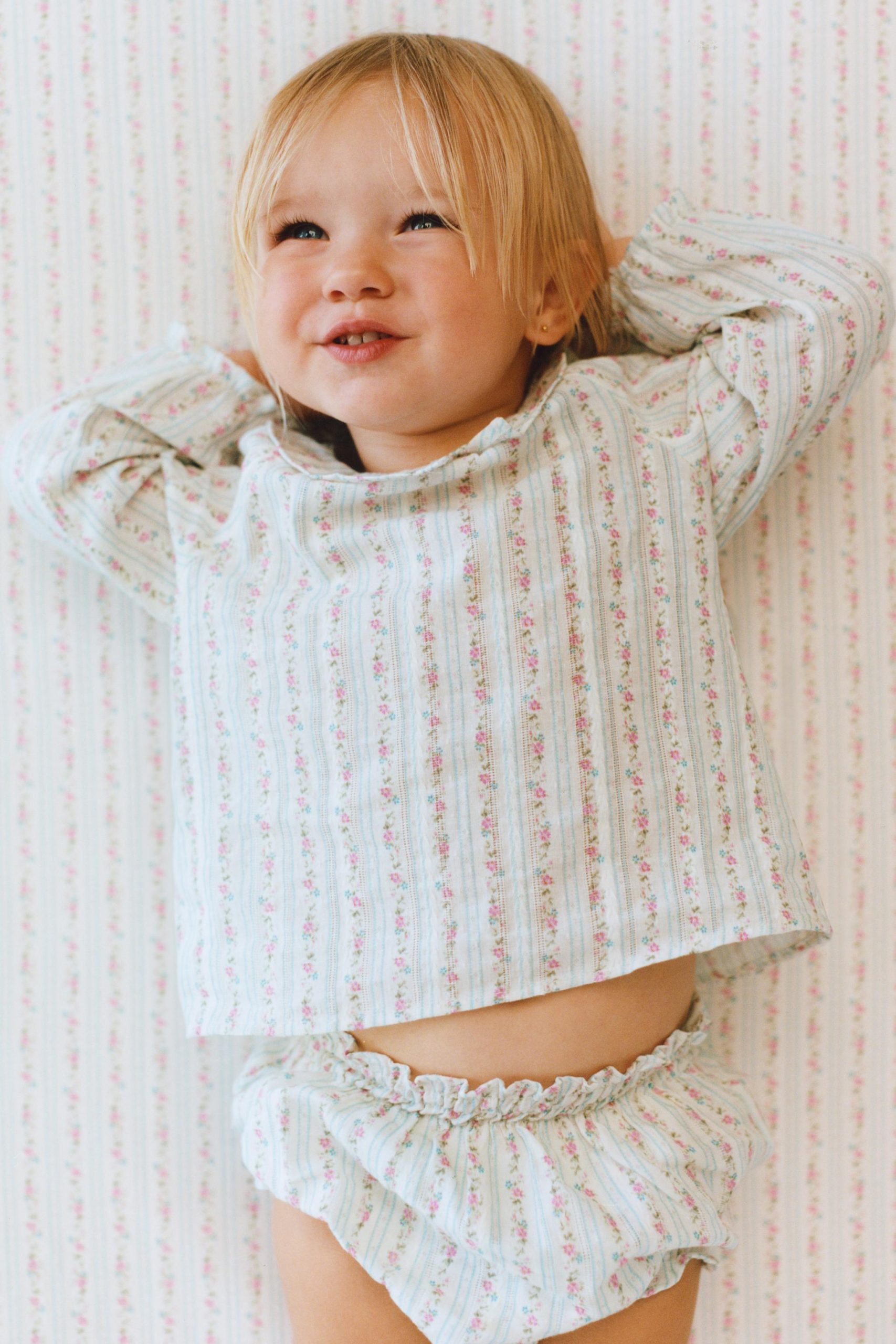 ست دو تکه. بلوز با یقه بچهگانه و آستینهای بلند کشی. بسته شدن از پشت با دکمه. دارای جزئیات چین در قسمت سینه. شورت با کمر کشی.