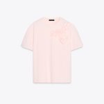 تی‌شرت با یقه گرد و آستین کوتاه. در قسمت جلو، جزئیات گل‌دار با حجم و رنگ‌های متنوع طراحی شده است.