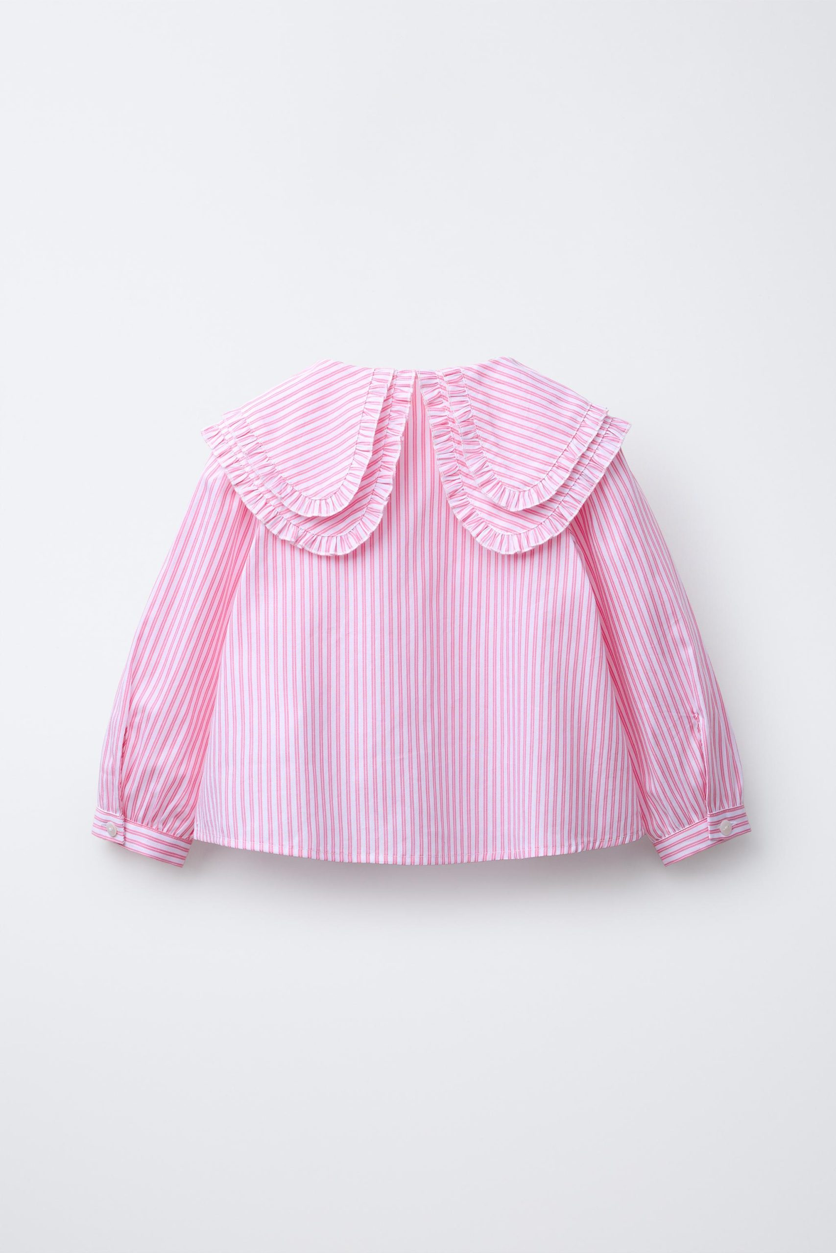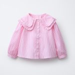 - Çift bebe yakalı, uzun kollu gömlek. Önden düğmeli. Çizgili desenli.