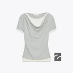 تی‌شرت یقه دراپه و کوتاه‌کف. دارای جزئیات داخلی ترکیبی با اثر دوگانه تی‌شرت در کنتراست.