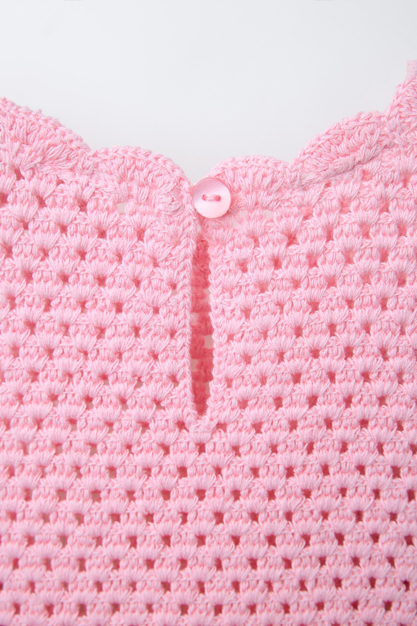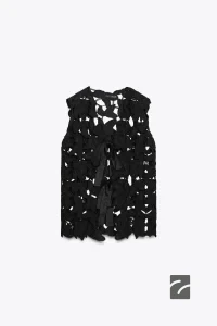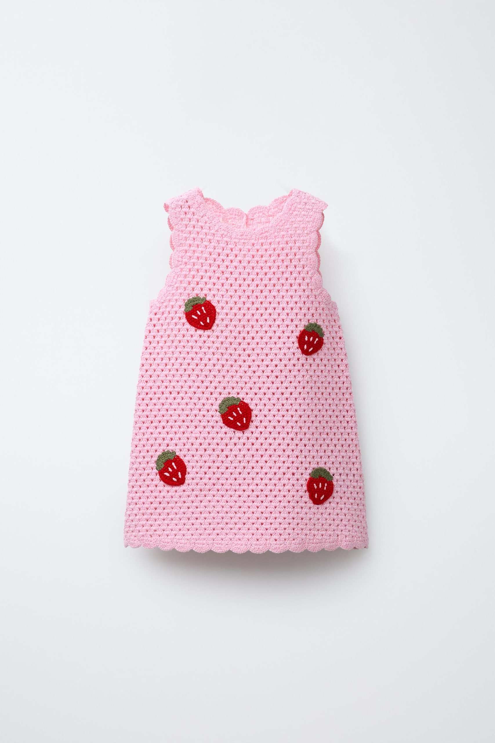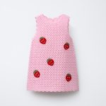 • Bisiklet yaka, kolsuz triko elbise. Sırtta düğmeli, yırtmaç kapamalı. Ön kısımda kroşe çilek aplikeli. Etek ucu dalgalı bitişli.