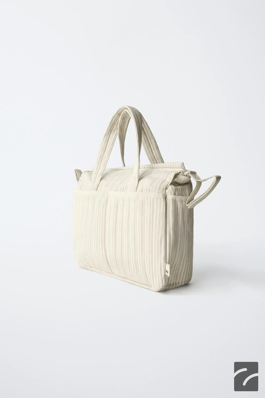 Çizgili baskılı anne çantası seti. Uygun makyaj çantası ve alt değiştirme matı. İç kısmı yıldız baskılı detaylı. Çizgili çanta: fermuarlı ana bölme. İki ön ve iki yan cep. Arabaya takmak için iki adet yapışkan şerit içerir. Çift taşıma sapı. Çizgili makyaj çantası: fermuarlı kapama. Çizgili alt değiştirme matı: yapışkan şeritli kapama. Bu set bölünemez, eksiksiz iade edilmelidir.