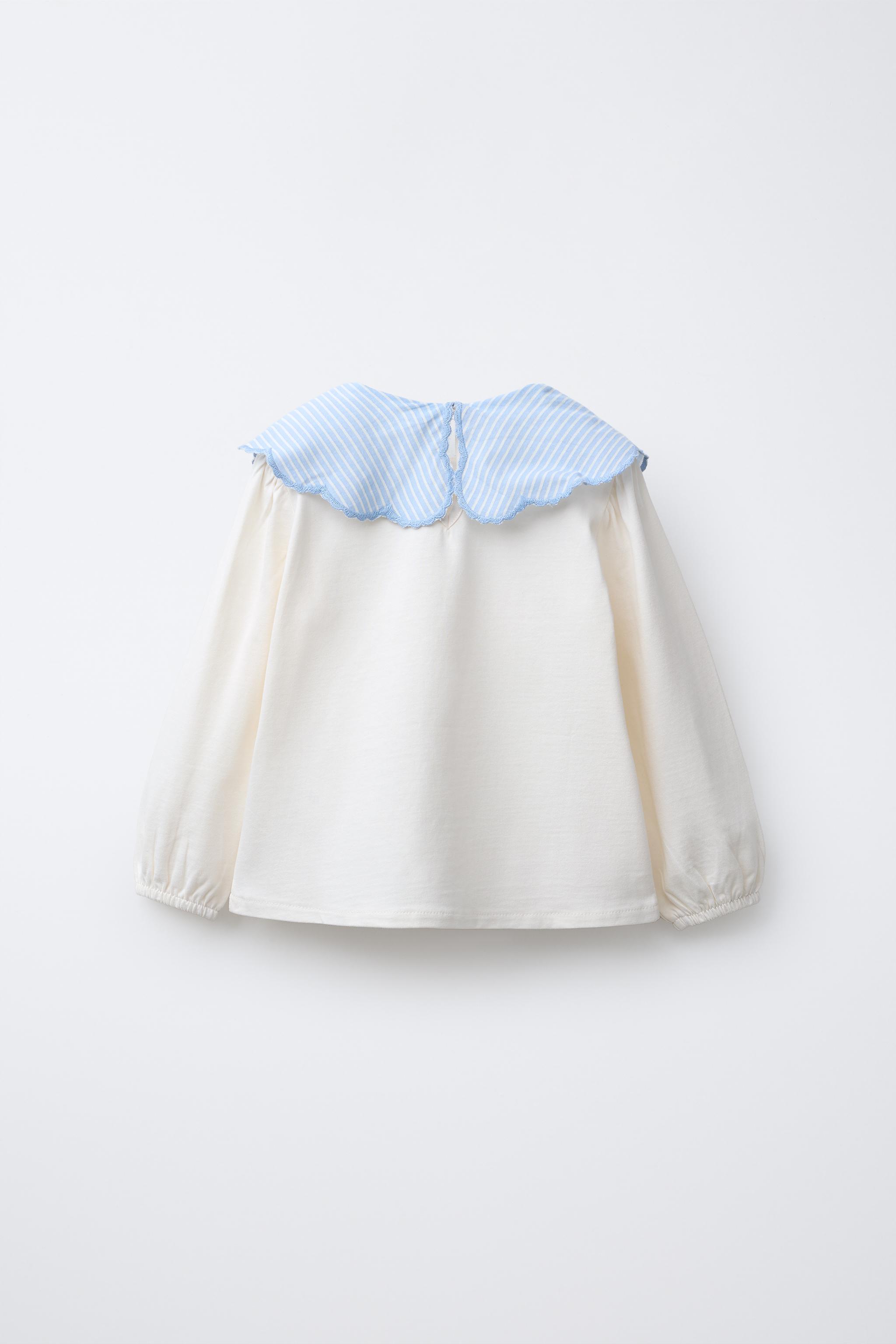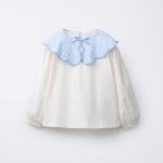 - Çizgili baskılı, bebe yakalı ve manşetleri lastikli uzun kollu tişört. Arkada yırtmaçlı düğme kapamalı. Ön kısımda fiyonk aplikeli.