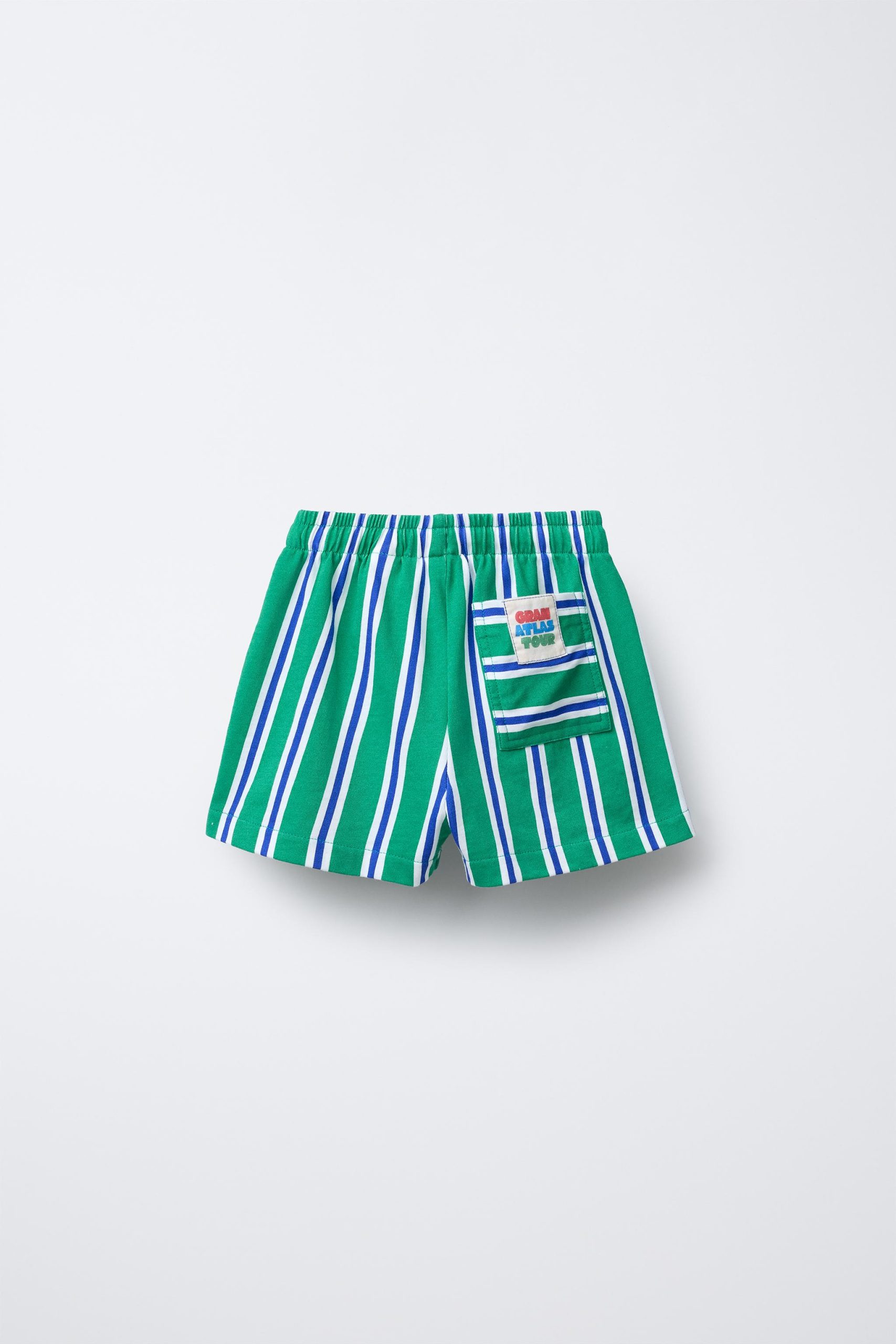 شلوار برمودا با کمر الاستیک و بندهای قابل تنظیم در جلو. دارای جیب پشتی با برچسب. از پارچه ۱۰۰% پنبه‌ای ساخته شده است.