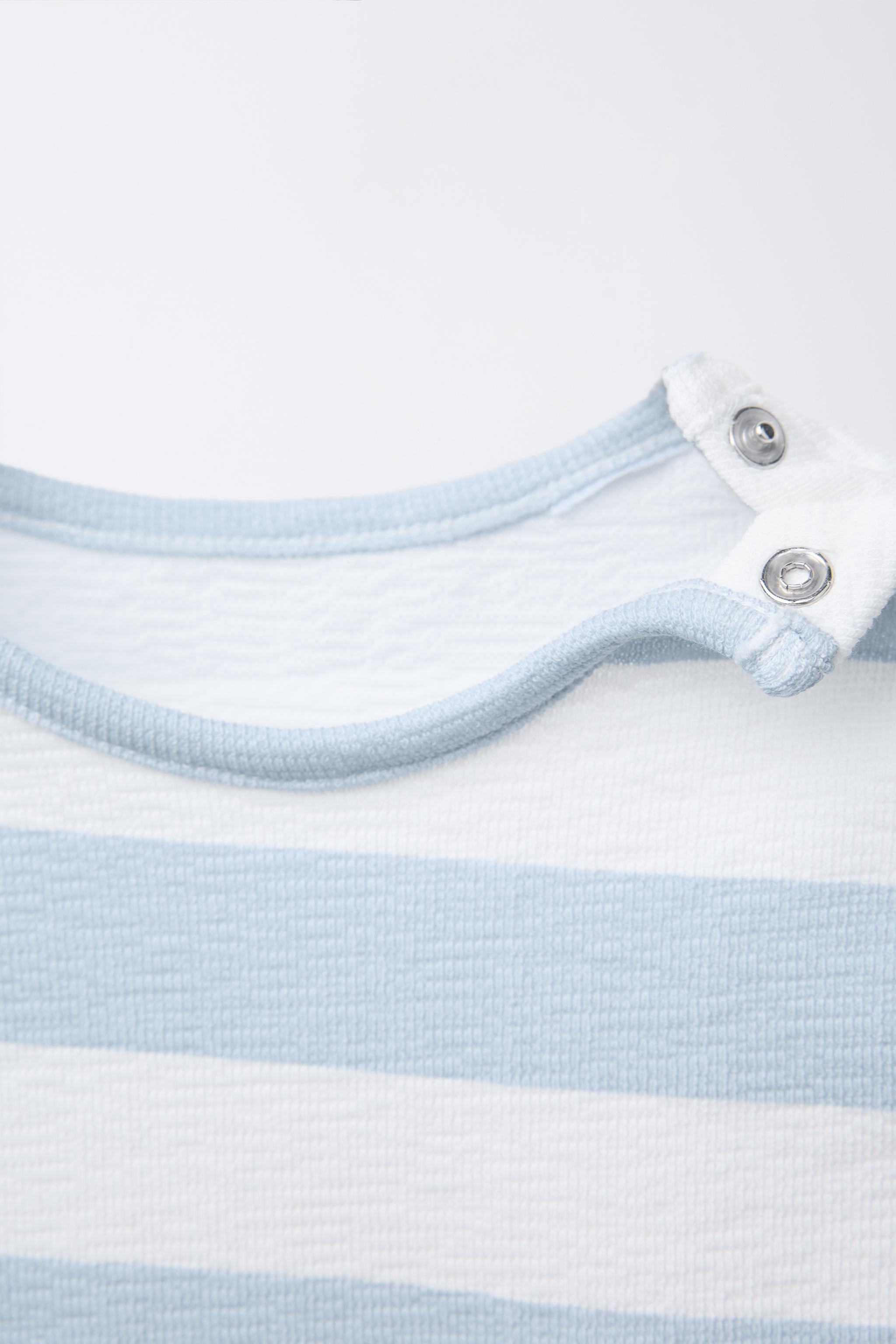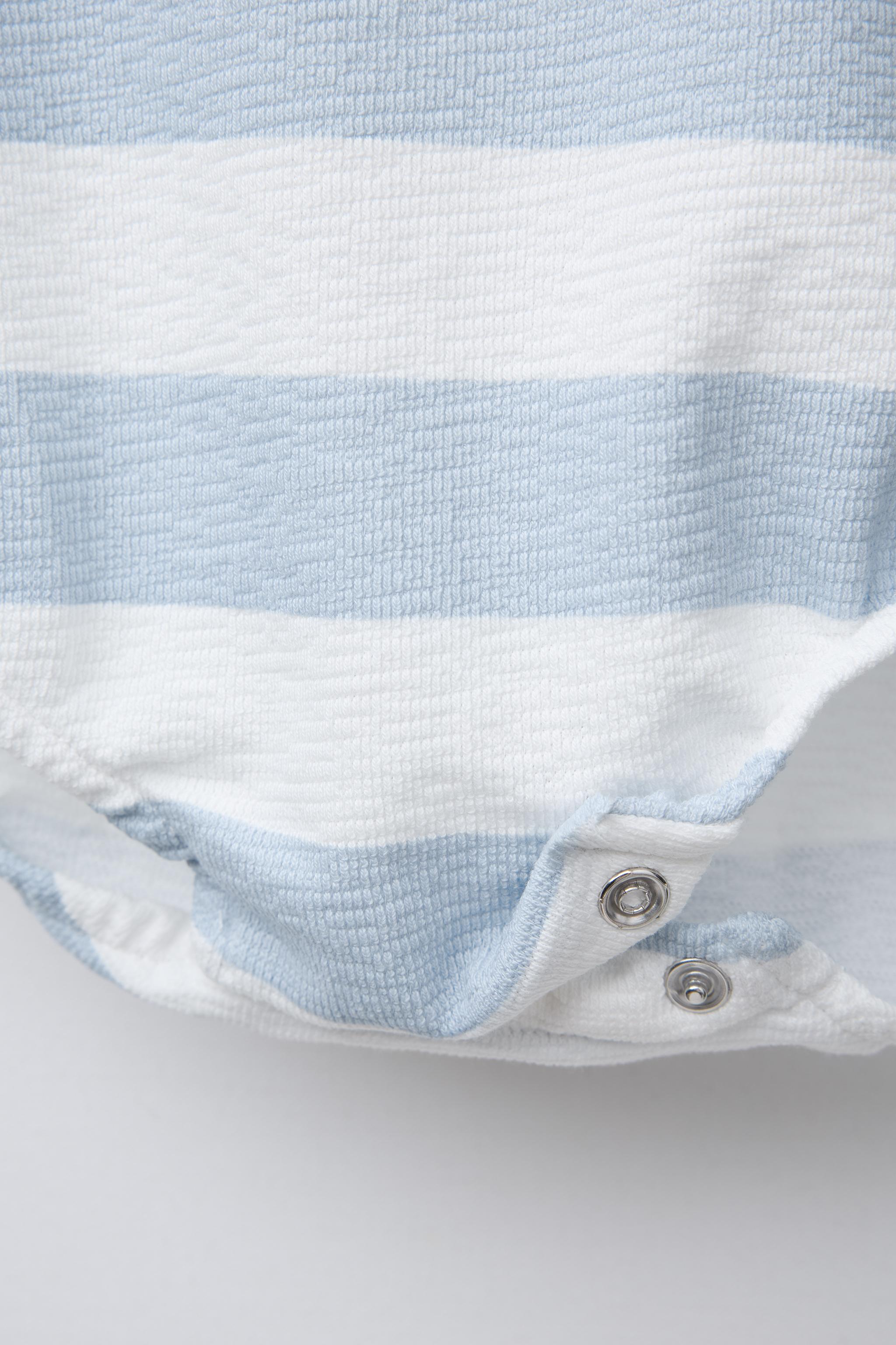 • Bisiklet yaka, kısa kollu body. Omuzda ve alt kısımda çıtçıtlı kapama. Çizgili baskılı. %100 pamuklu kumaş.