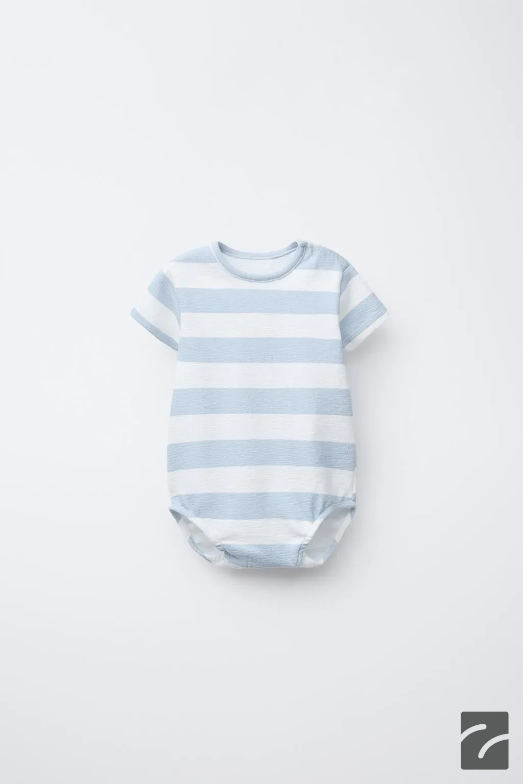 Bisiklet yaka, kısa kollu body. Omuzda ve alt kısımda çıtçıtlı kapama. Çizgili baskılı. %100 pamuklu kumaş.