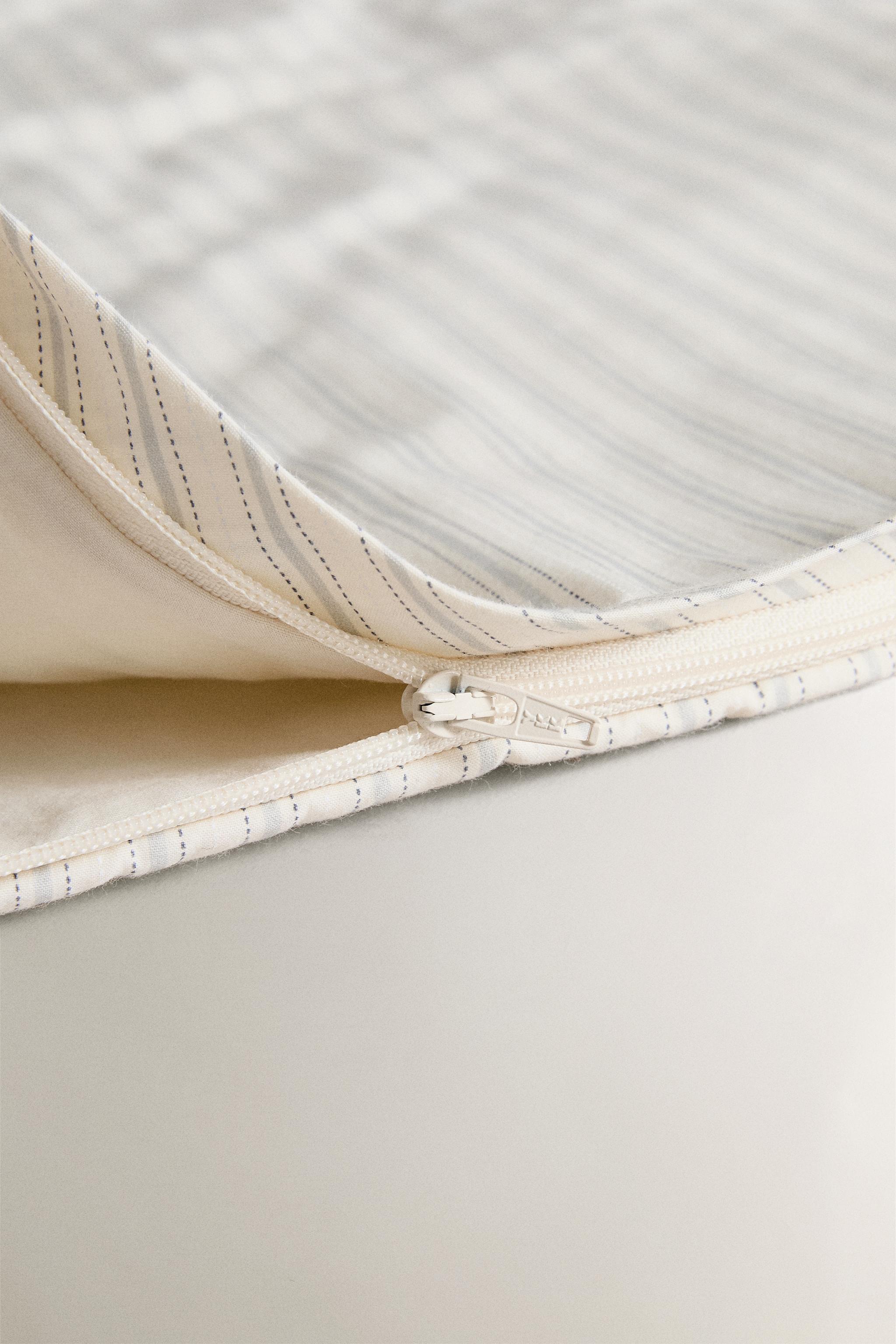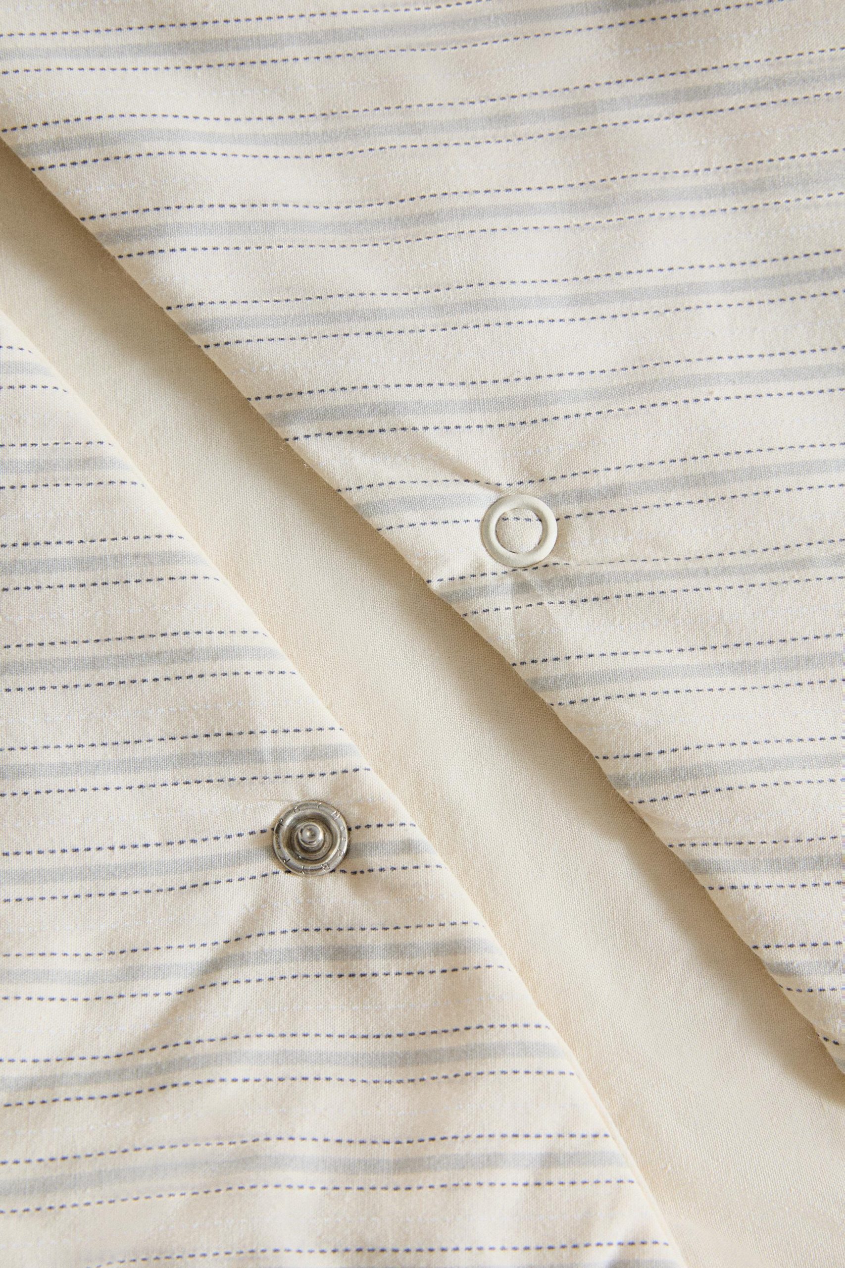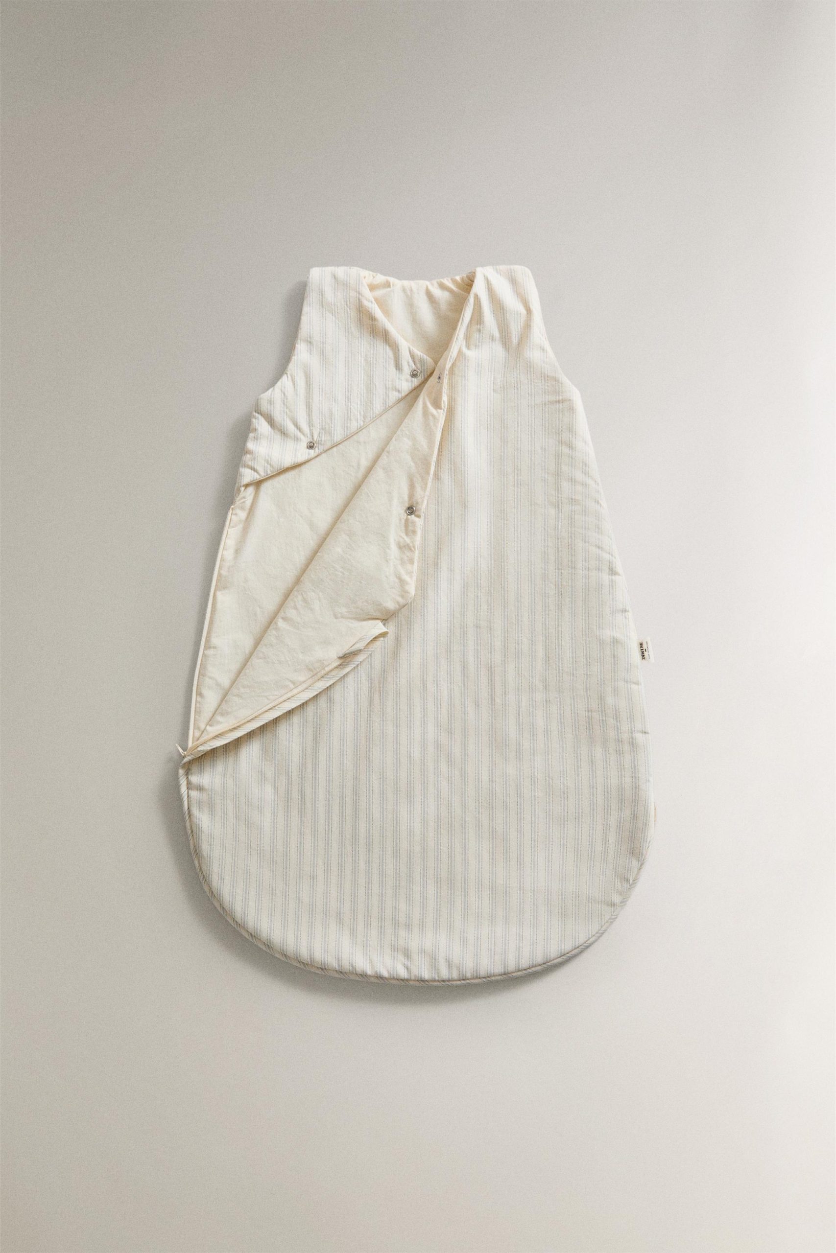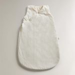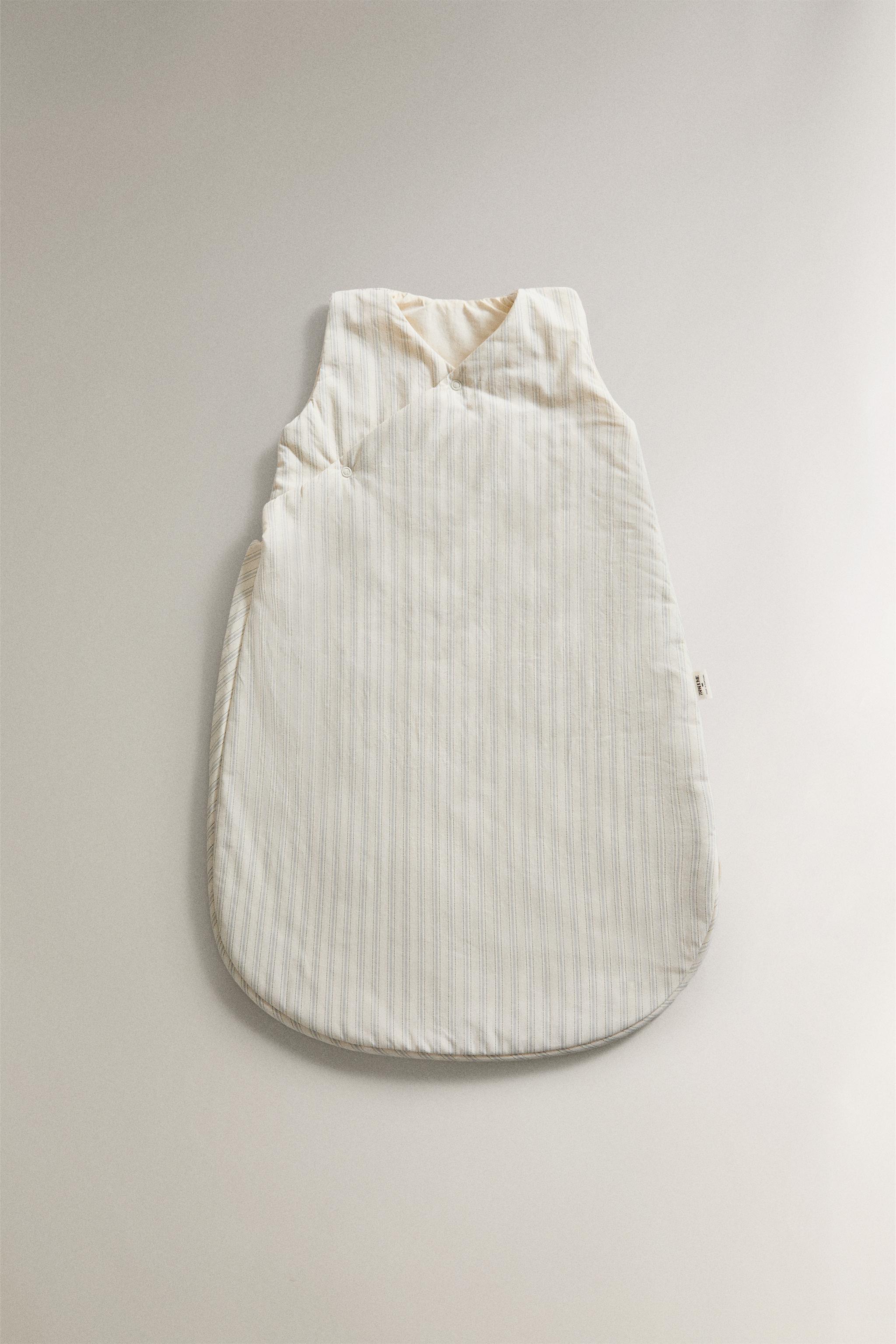 Çizgili tasarımlı pamuktan üretilmiş bebek uyku tulumu. Yan fermuar ve düğmelerle kapanır