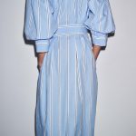 Pamuk ipliğinden üretilmiş midi elbise. Bisiklet yaka ve manşetli balon kollu. Aynı kumaştan bağcıklı ayarlanabilir kemer. Önden düğmeli kapama.