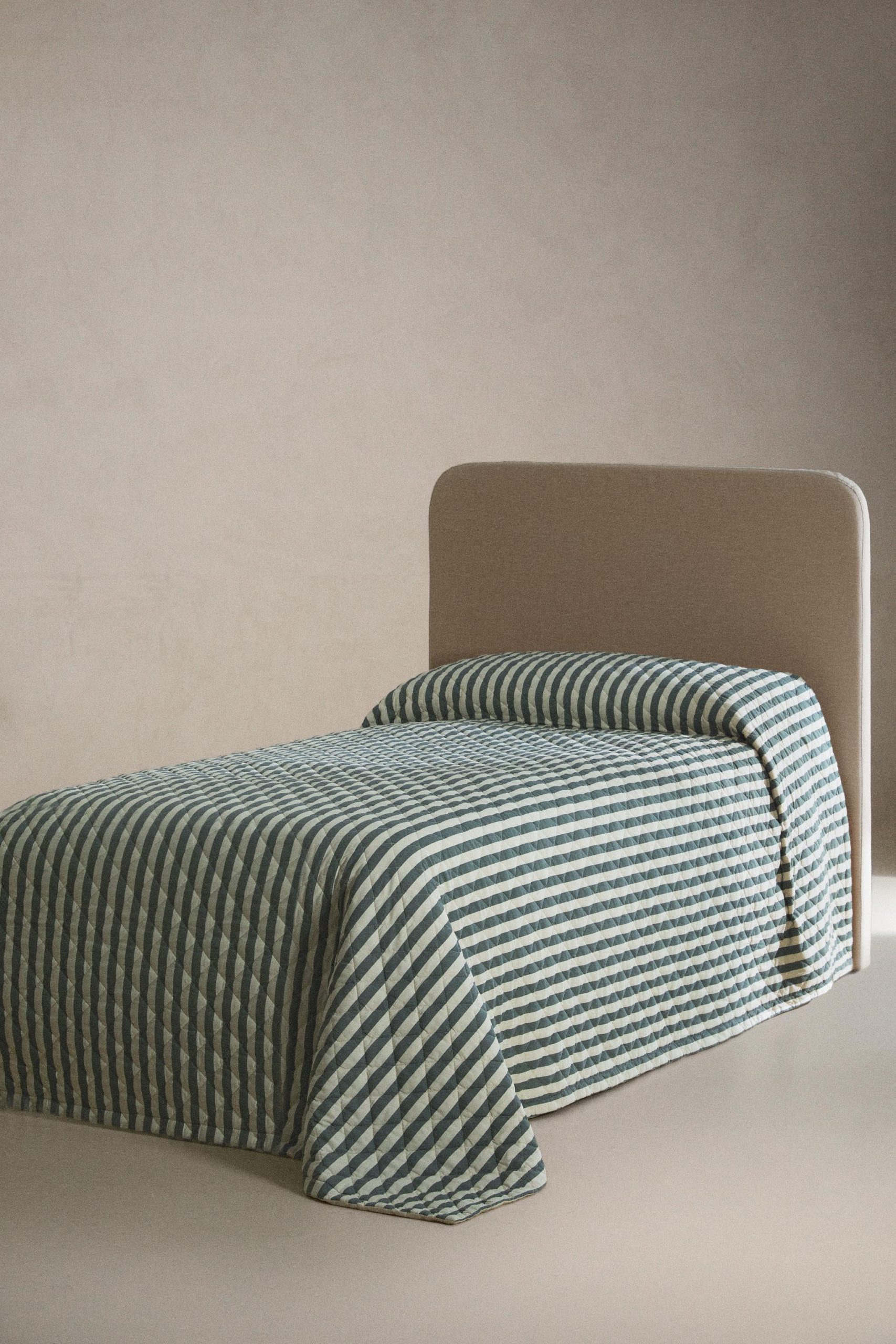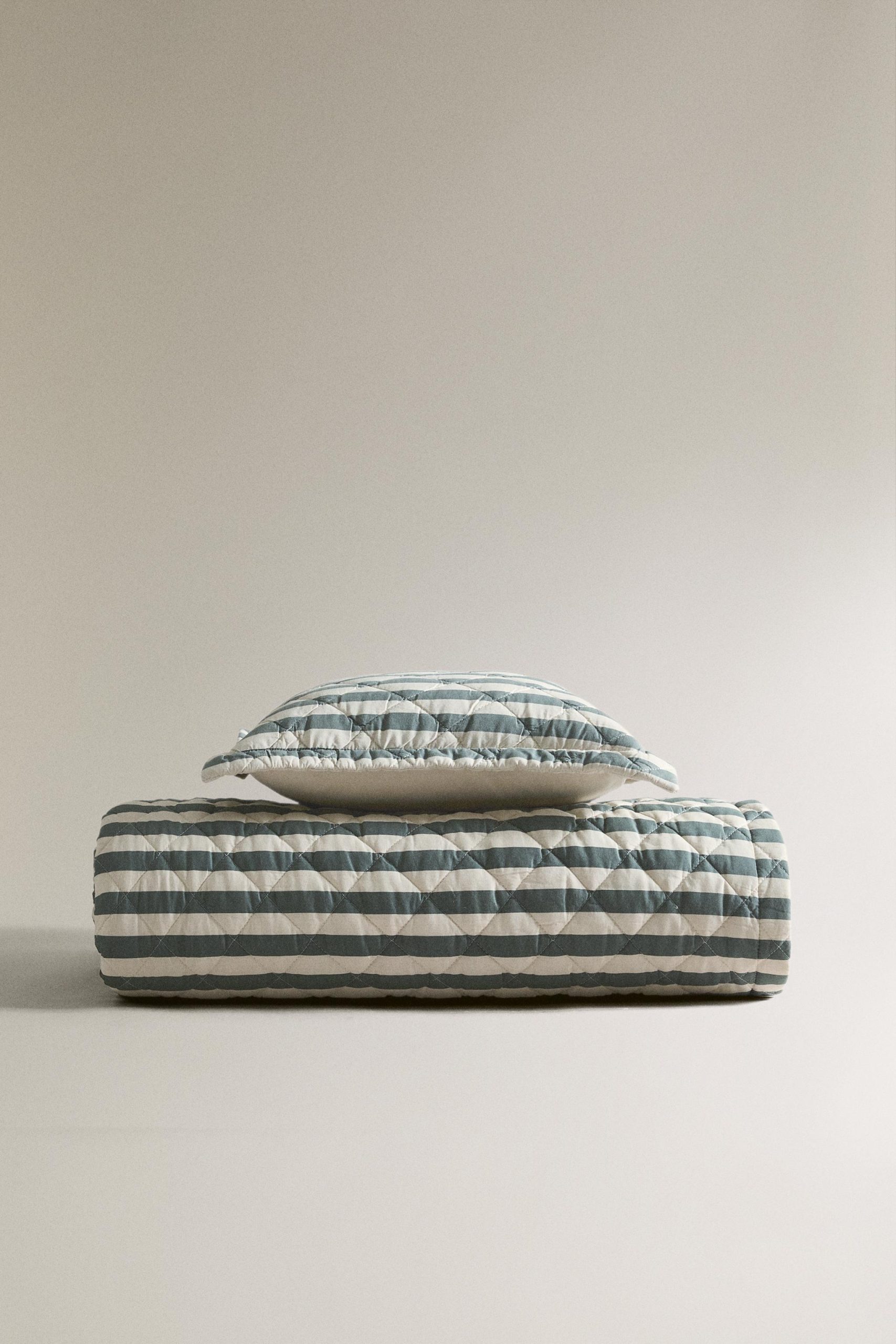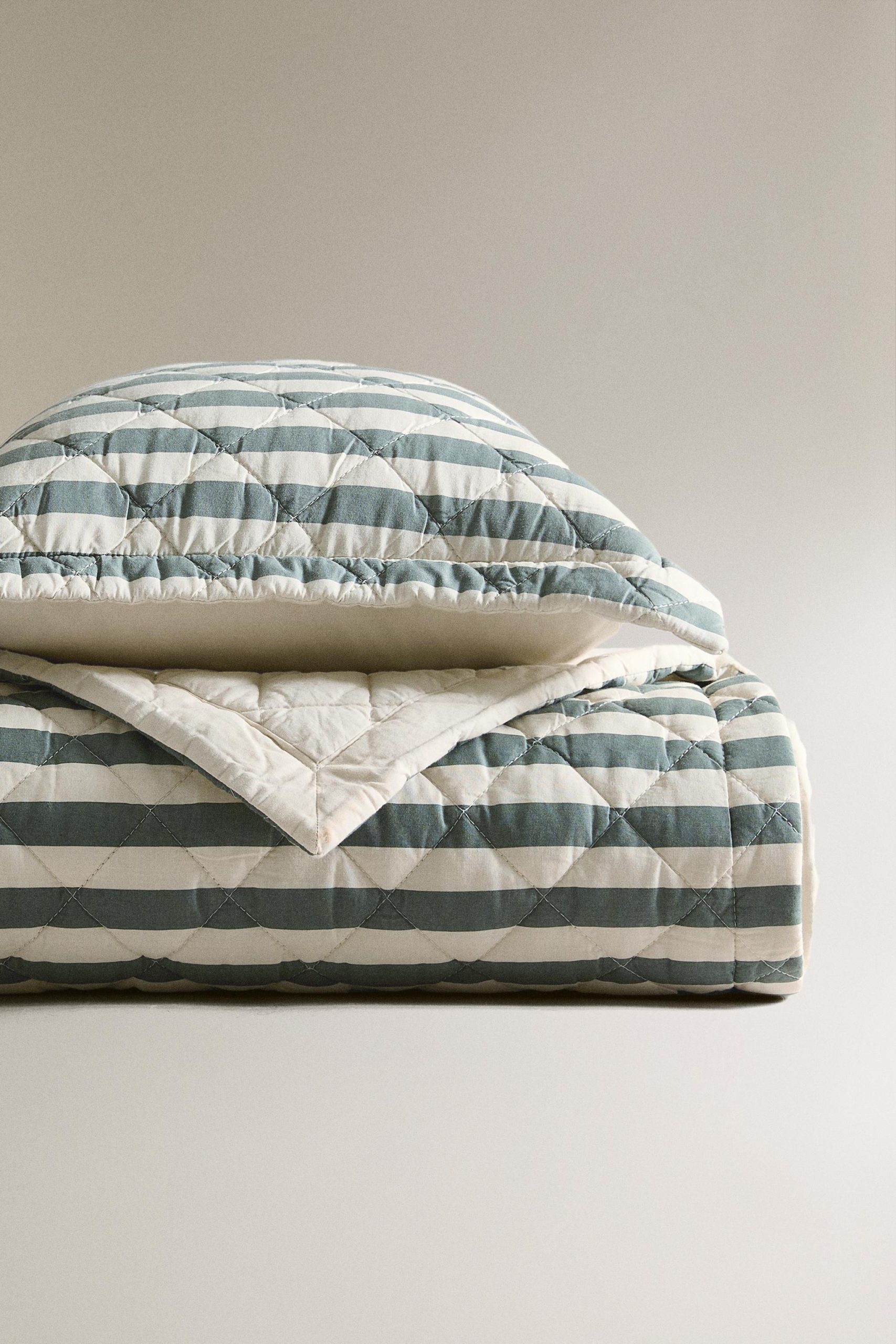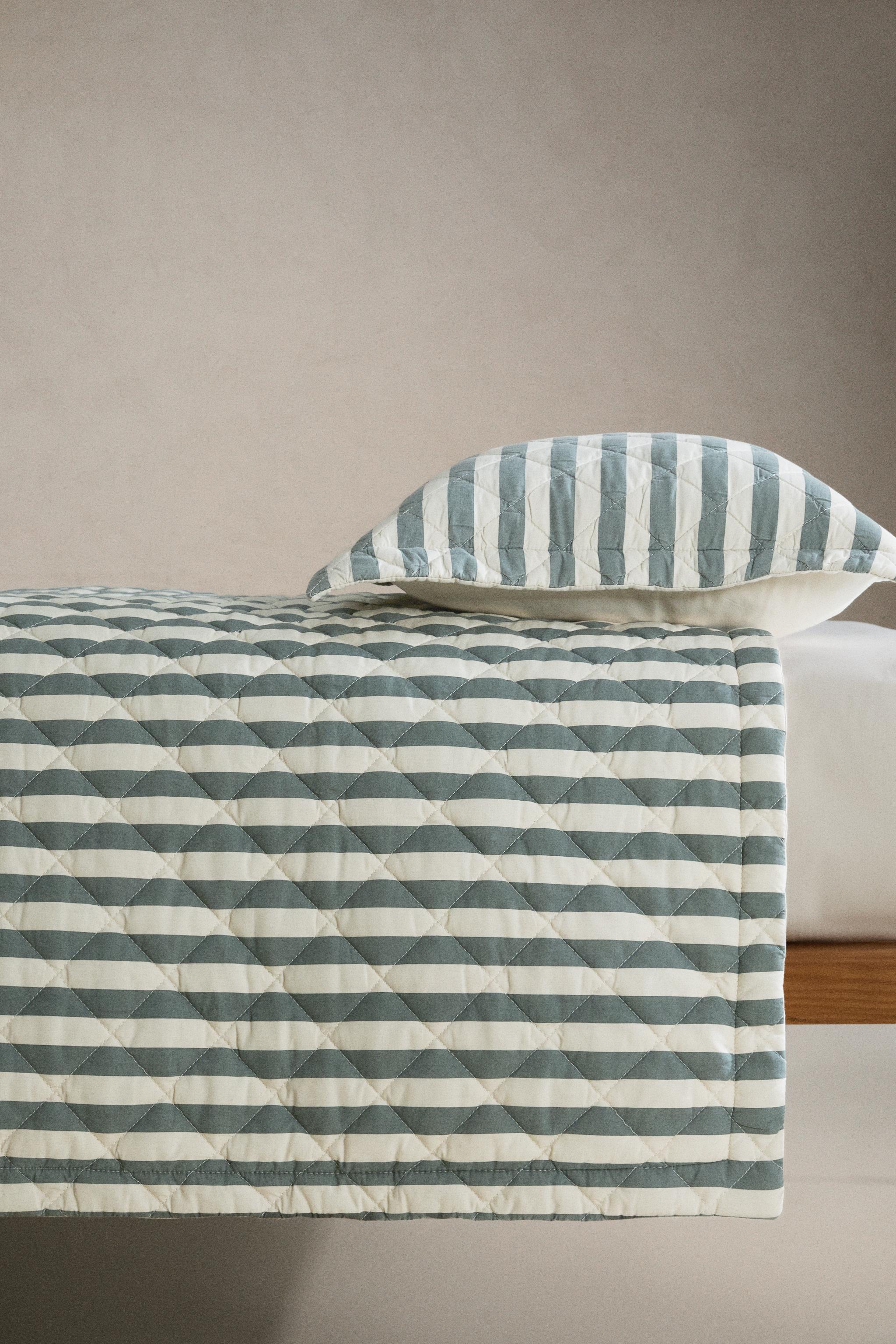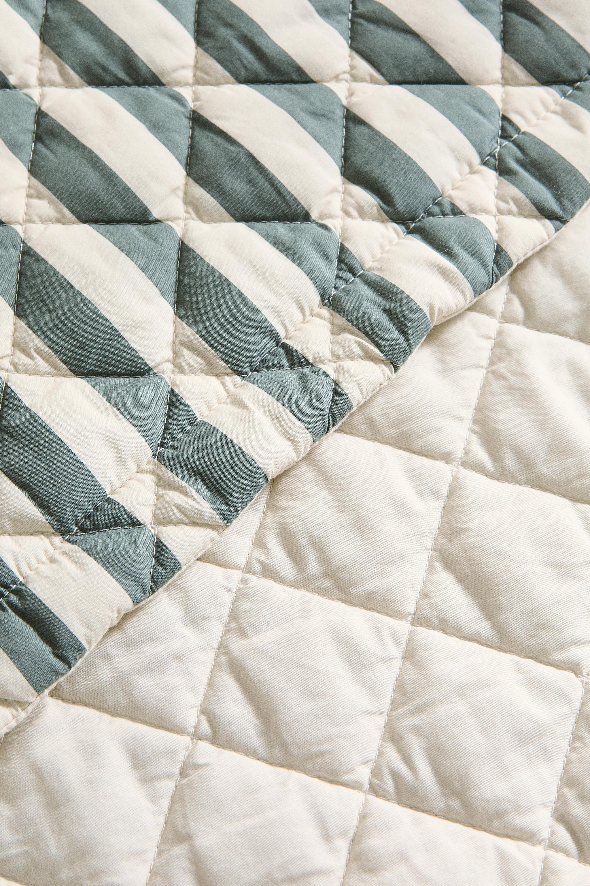 Dikişleri baklava desenli, çizgili, pamuklu çocuk yorganı.
