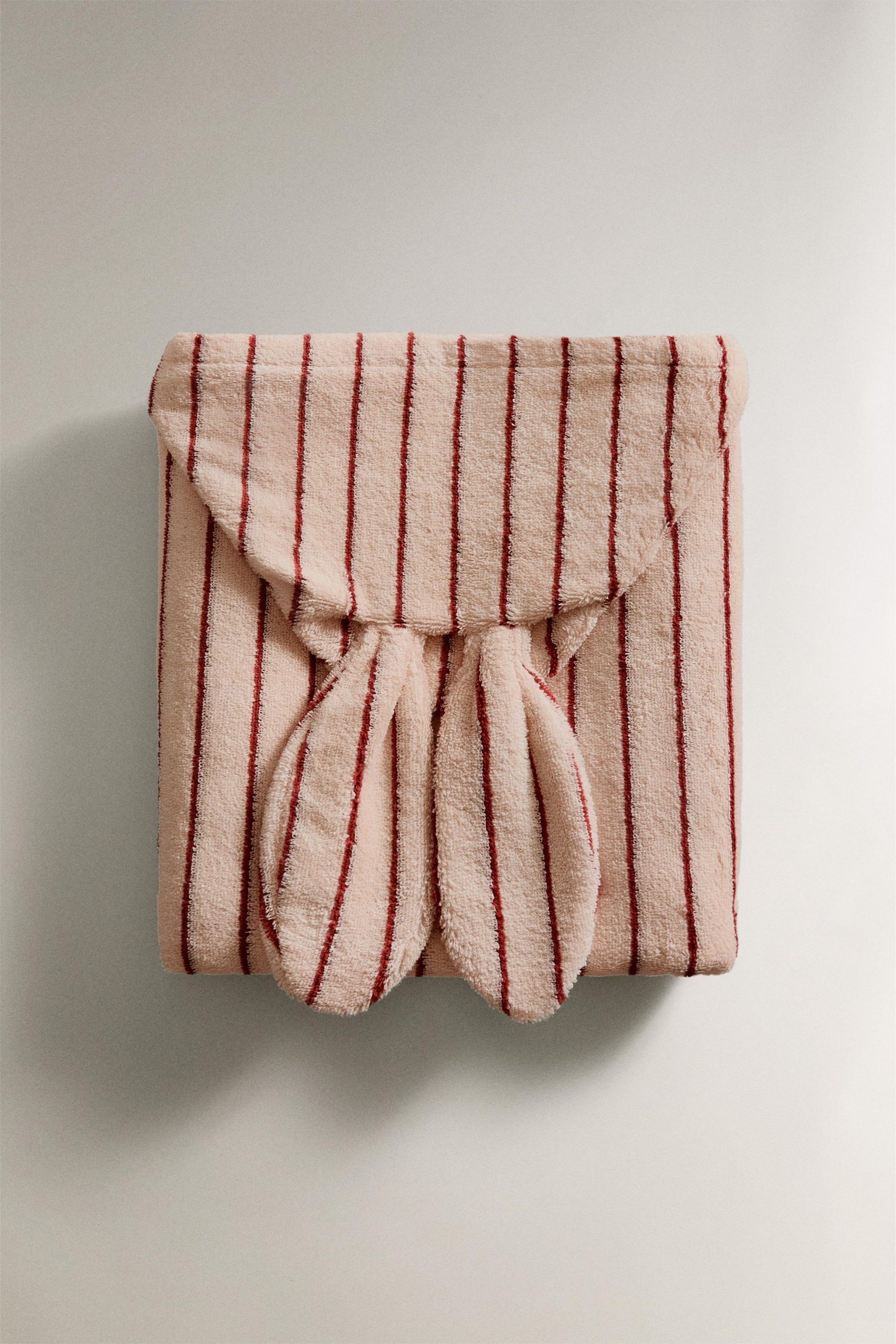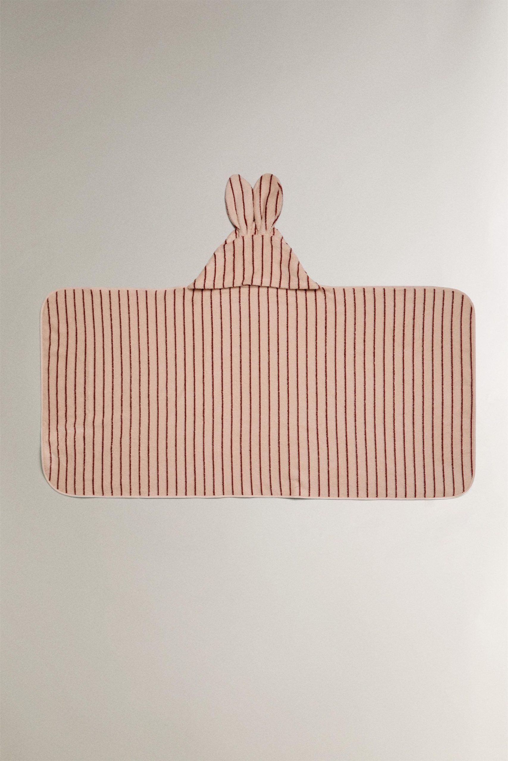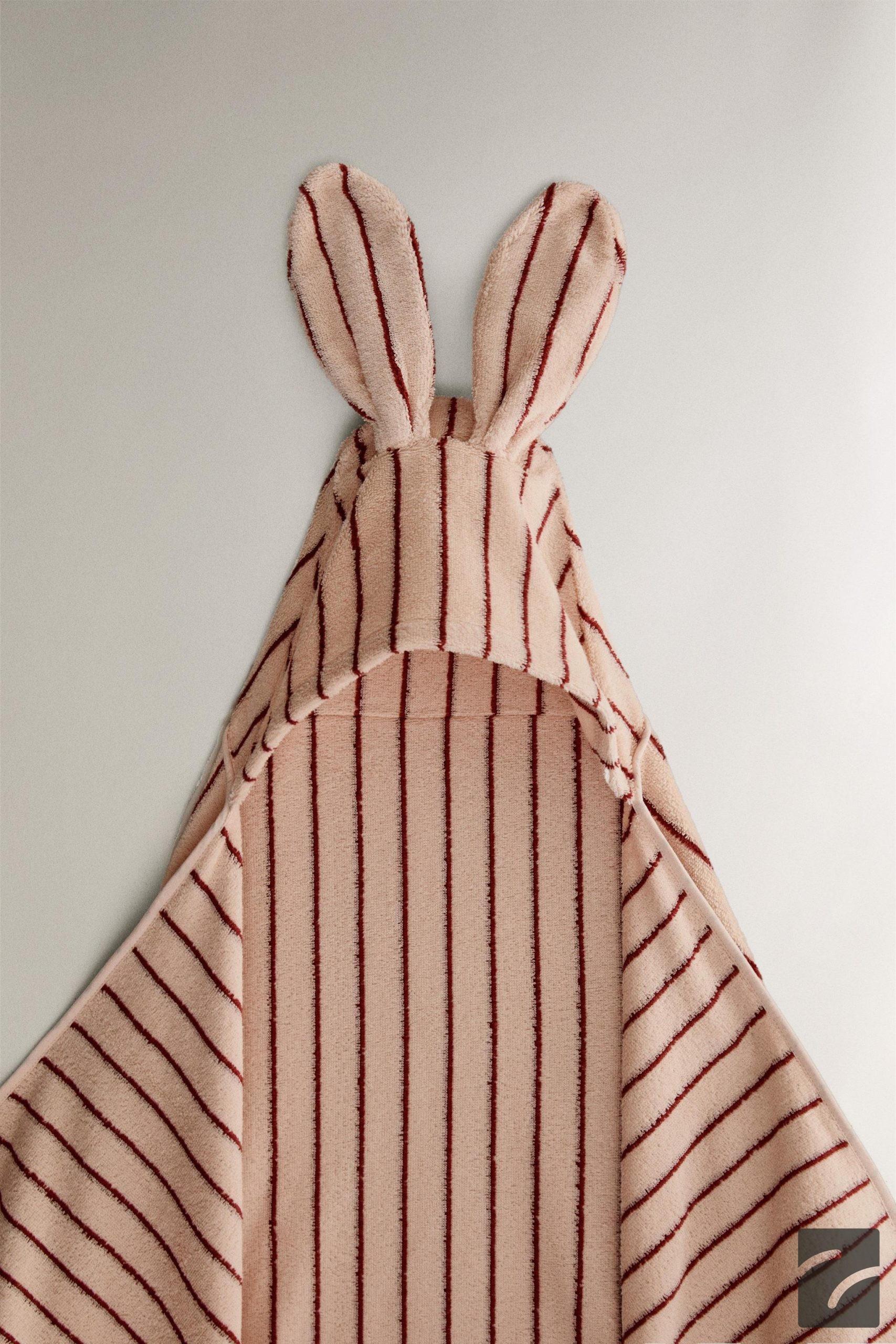 Velur pamuklu kumaştan üretilmiş, ince çizgili tasarıma sahip ve kapüşonunda kulak detayı bulunan kapüşonlu banyo havlusu.