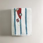 حوله حمام کودک ساخته شده از مخمل پنبه‌ای، دارای جزئیات گلدوزی شده با طرح سگ مسابقه‌ای و الگوی راه‌راه است.