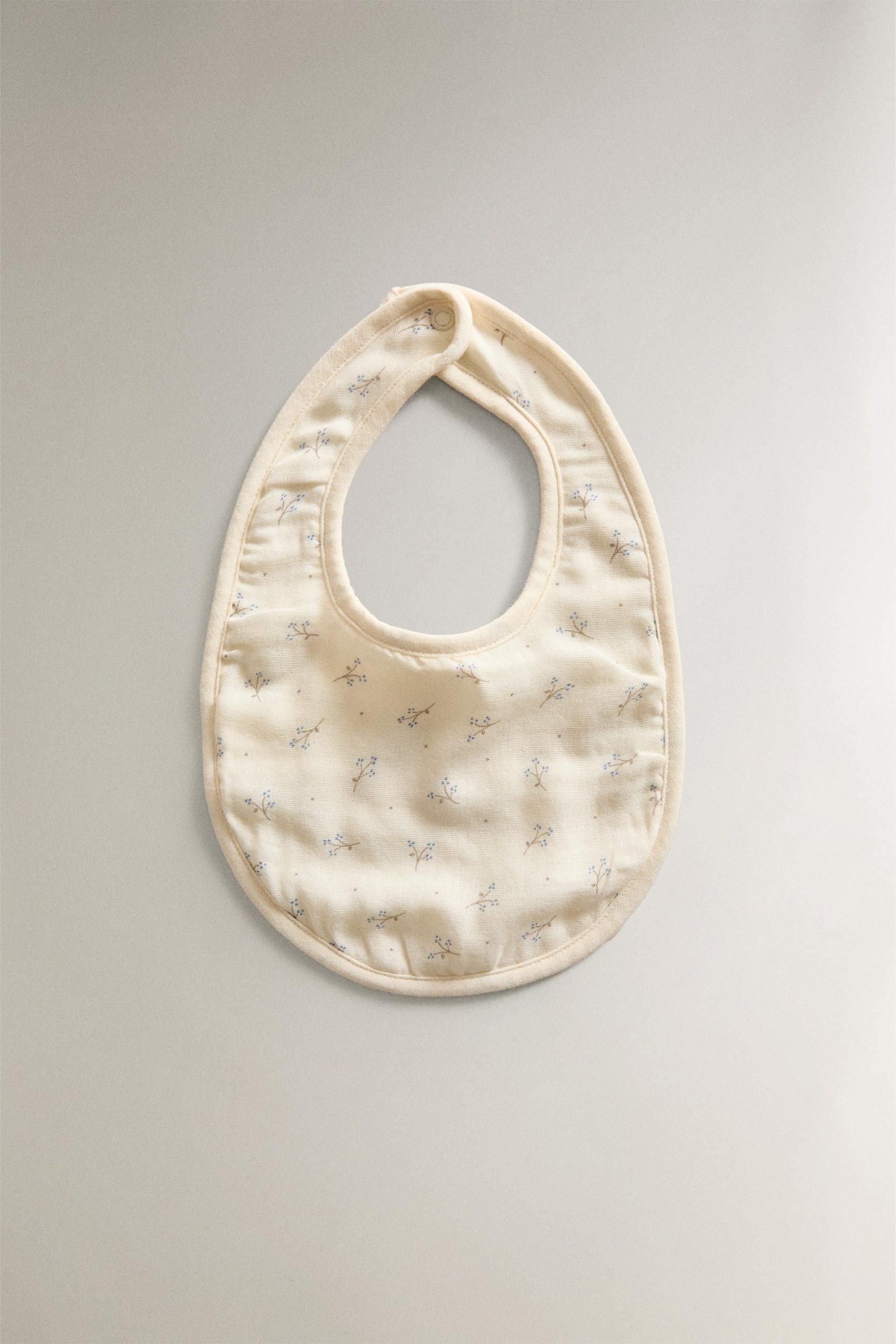 Mini havlu pamuklu kumaş ve muslin kumaştan üretilmiş, mini çiçek desenli ve bağcıklı bebek önlüğü.