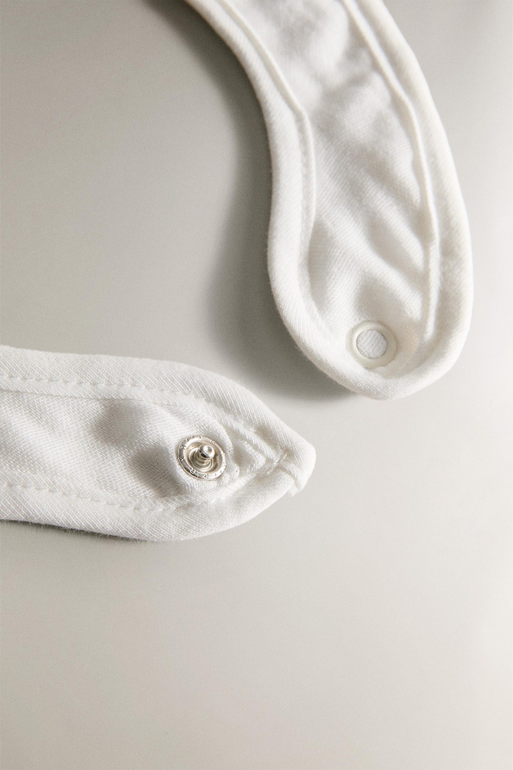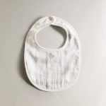 • Pamuklu mini havlu kumaş ve muslin kumaştan üretilmiş, fil desenli ve bağcıklı bebek önlüğü.
