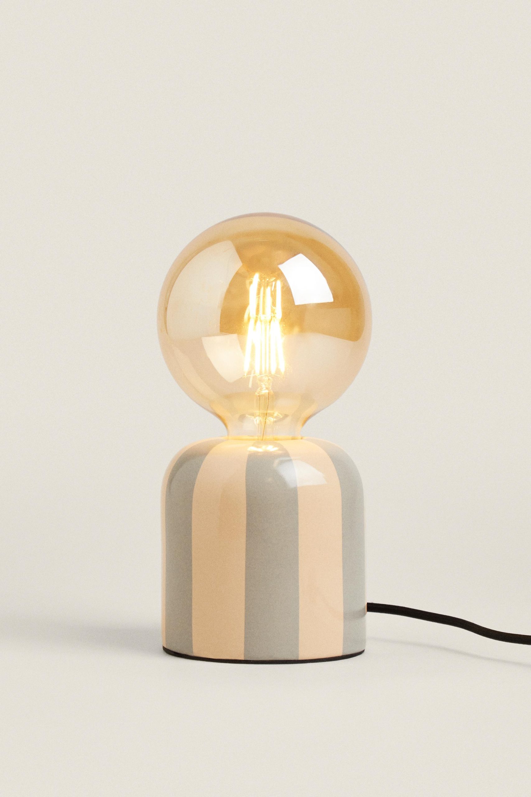 Çocuklar için çizgili seramik tabanlı abajur. Filamanlı ampul dahildir.