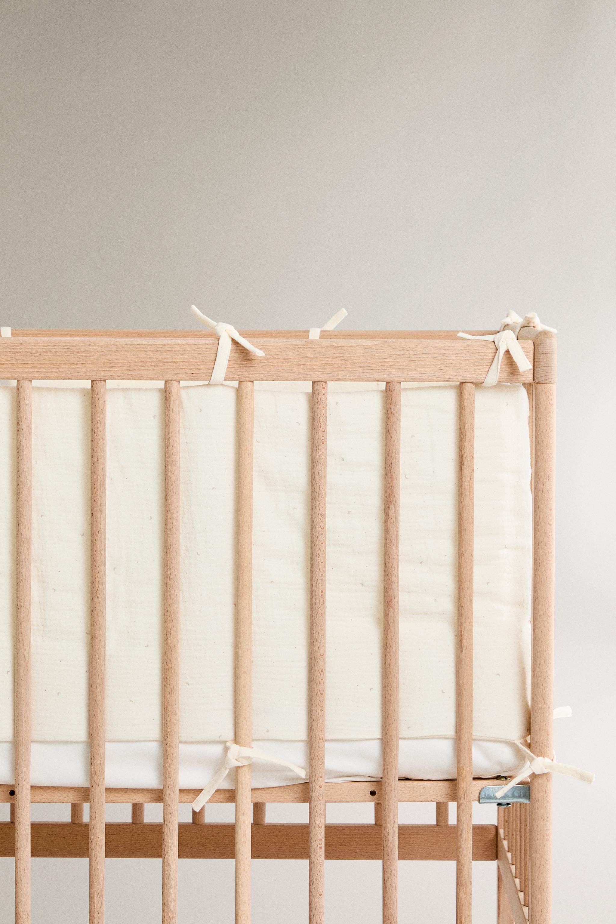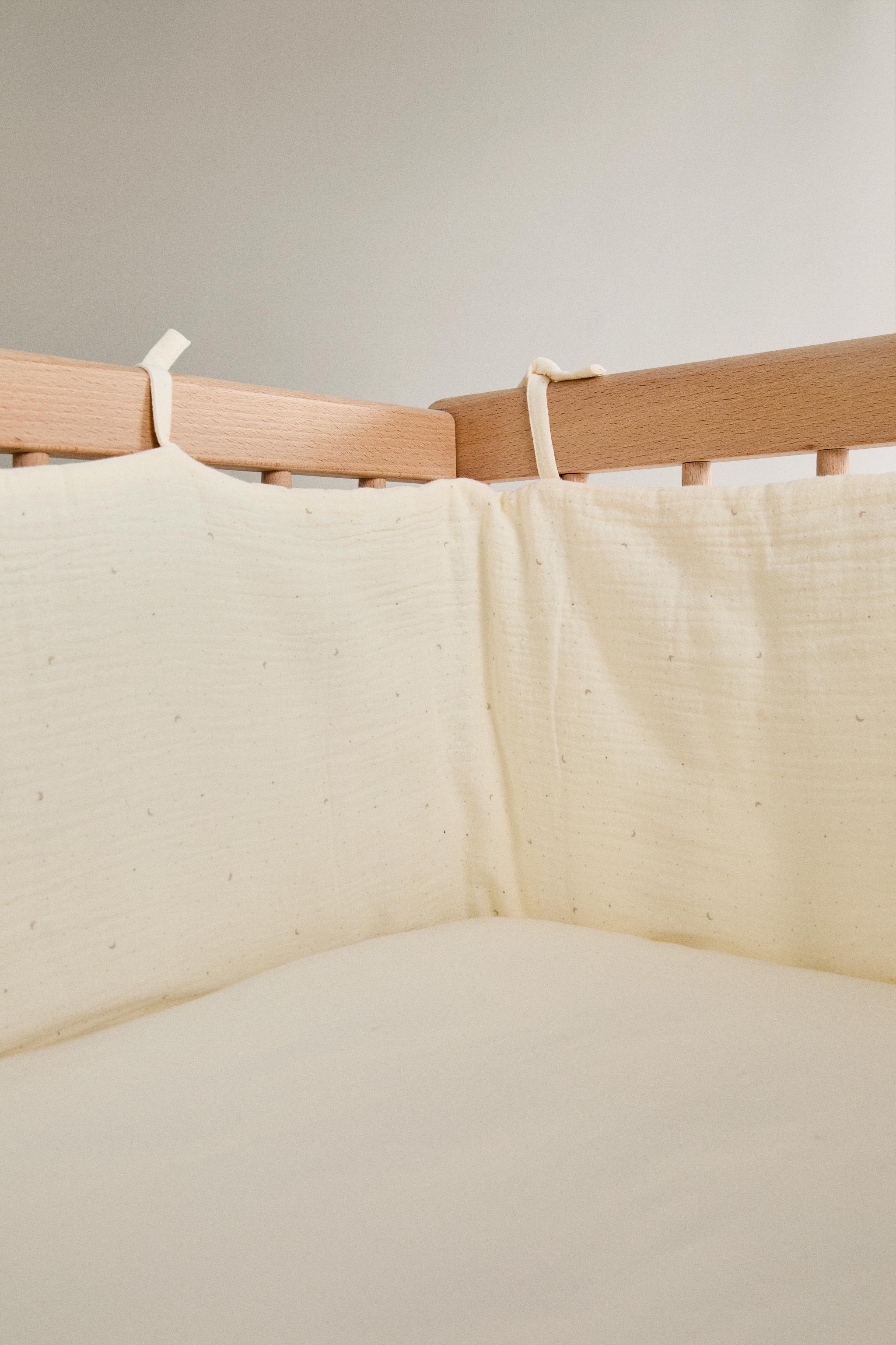 Ay desenli pamuklu muslin kumaştan üretilmiş, beşik için bebek baş koruyucu. Beşiğe bağlamak için bağcıkları bulunur.