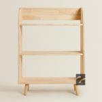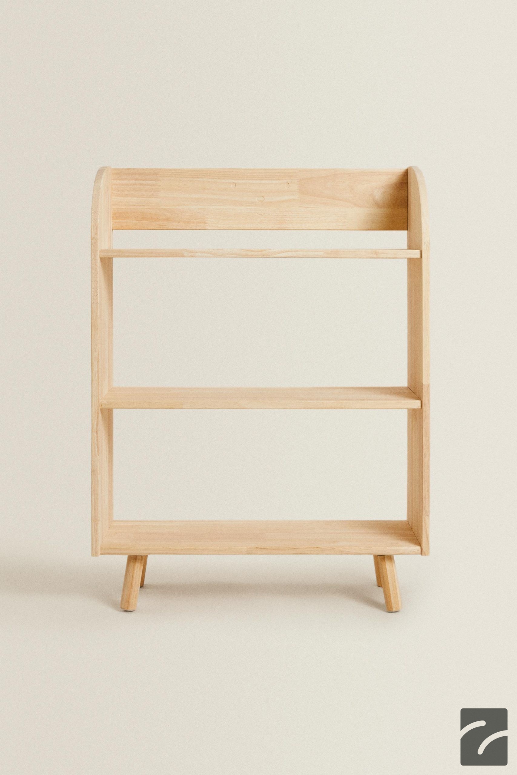 - Çocuklar için çam ağacından yapılmış, ayaklı ve üç raflı raf ünitesi.