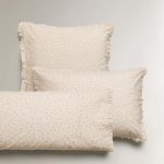 • Çiçek desenli ve fırfır şeritli, 200 iplikli pamuklu yastık kılıfı.