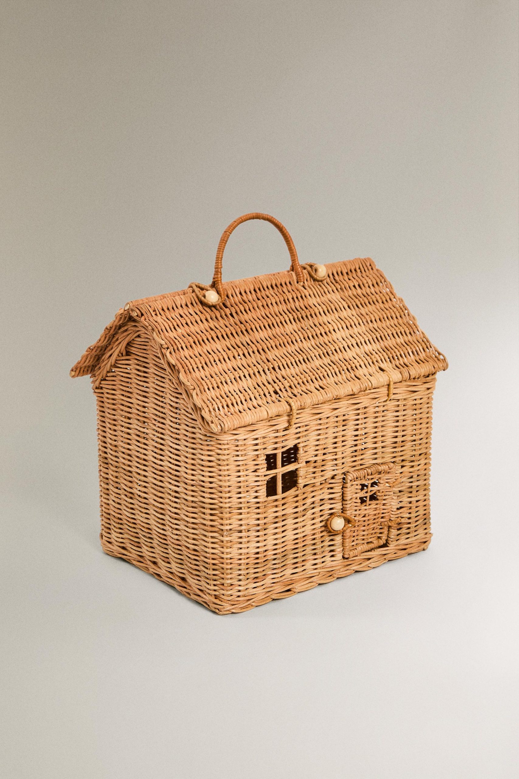 سبد بافت رتن برای سازماندهی اسباب بازیها به شکل خانه برای کودکان.
