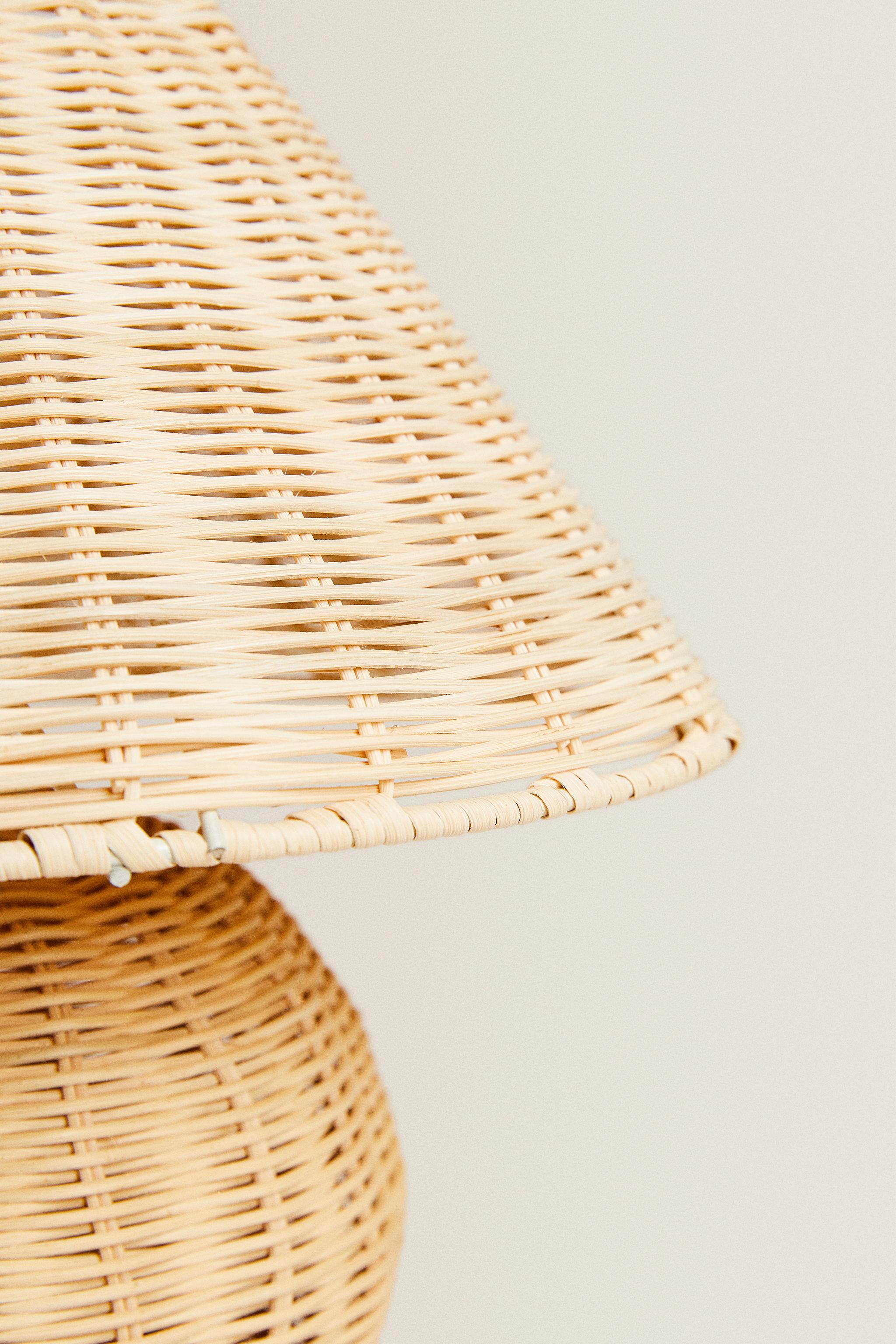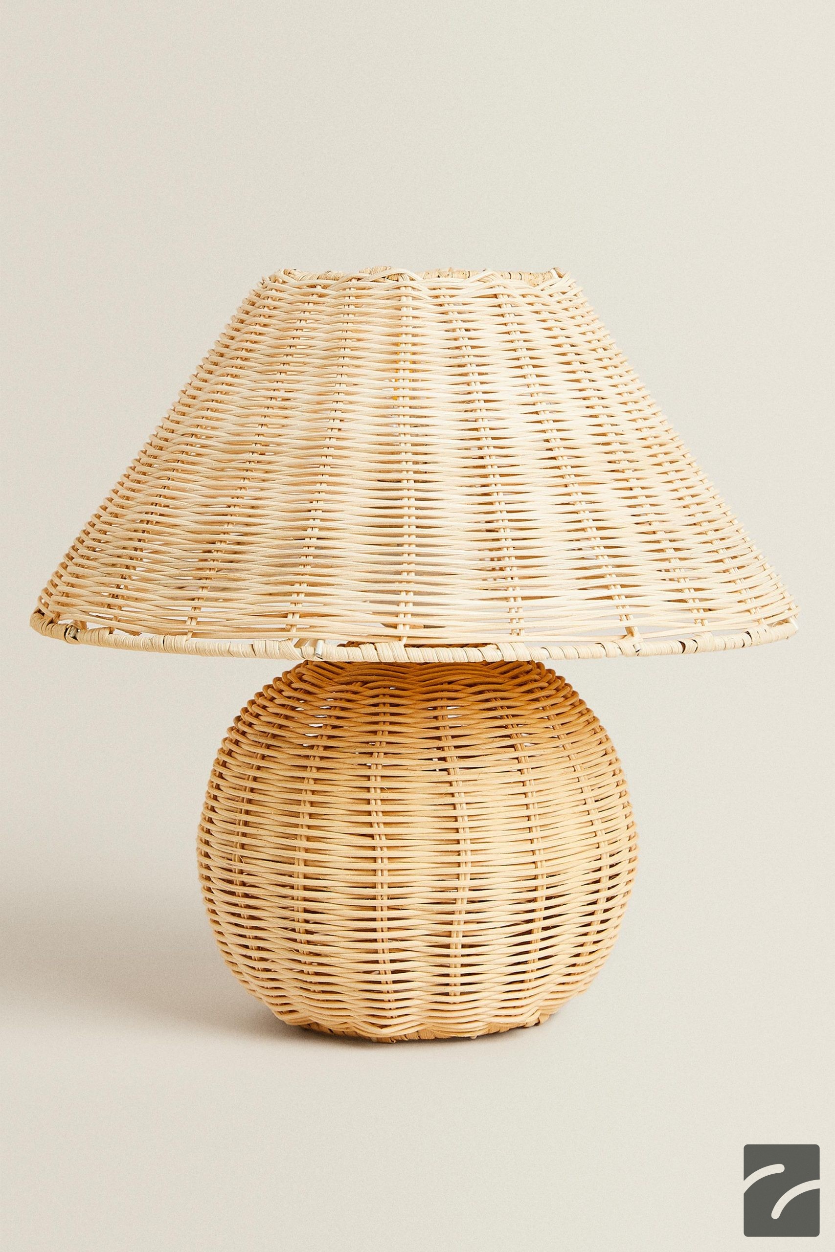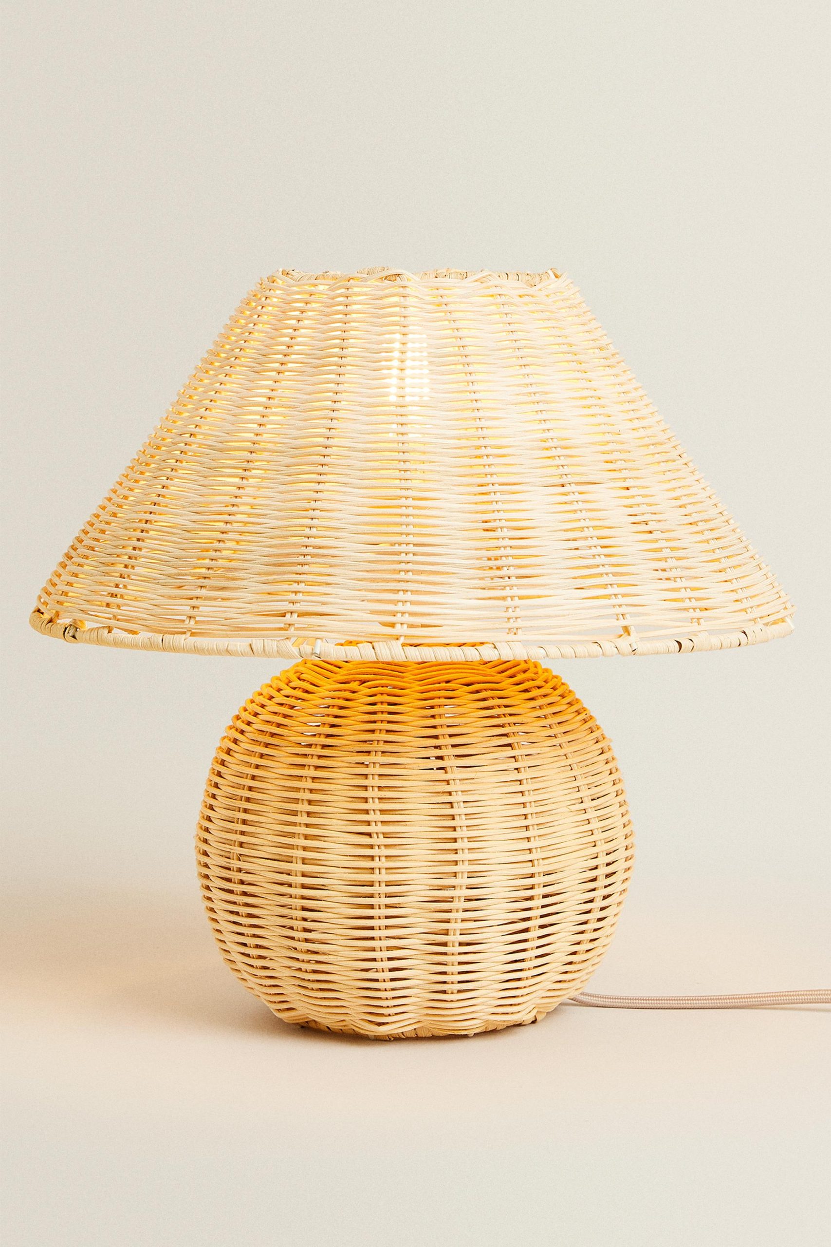 چراغ رومیزی با پایه و کلاهک بافته شده از رتن برای کودکان.
