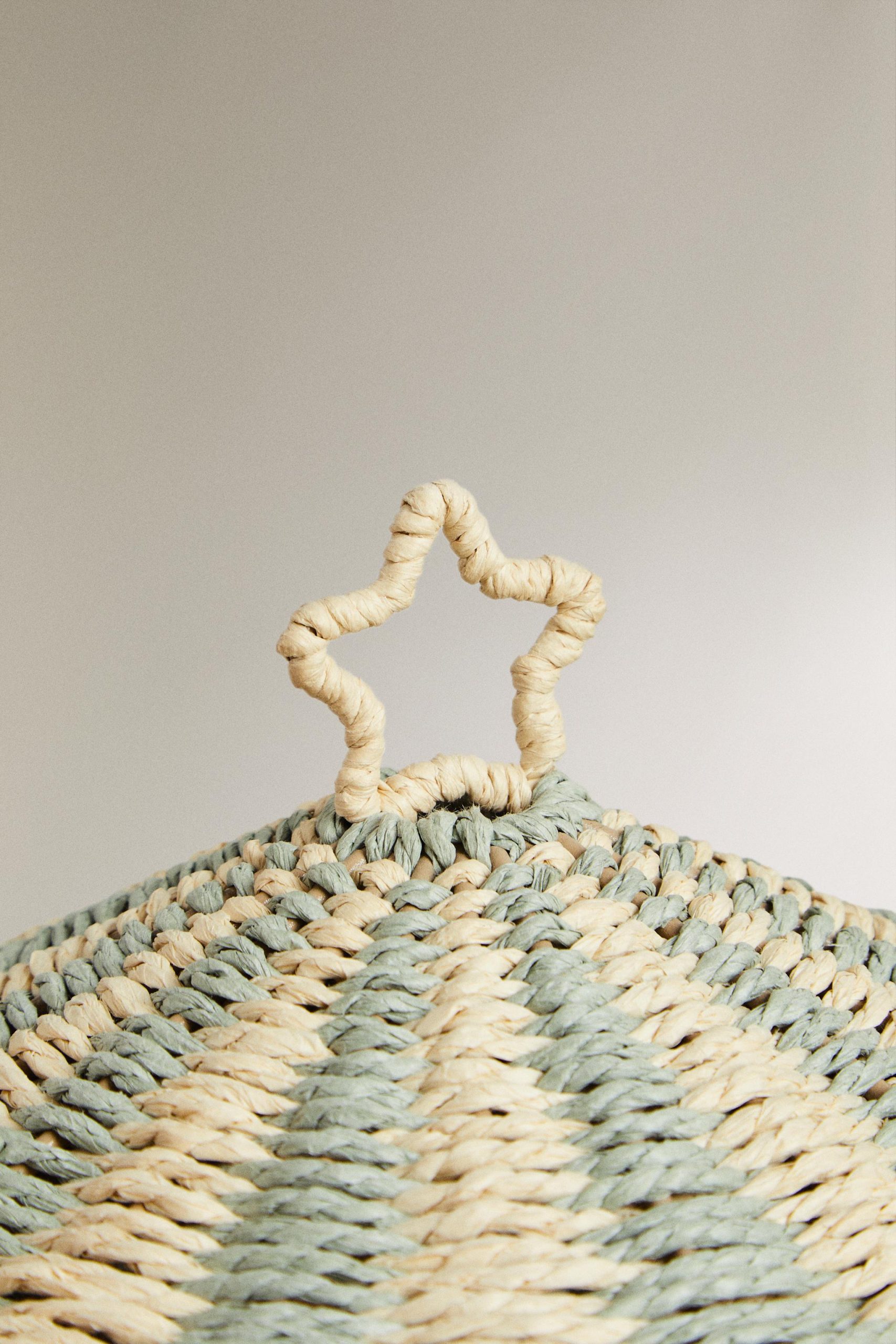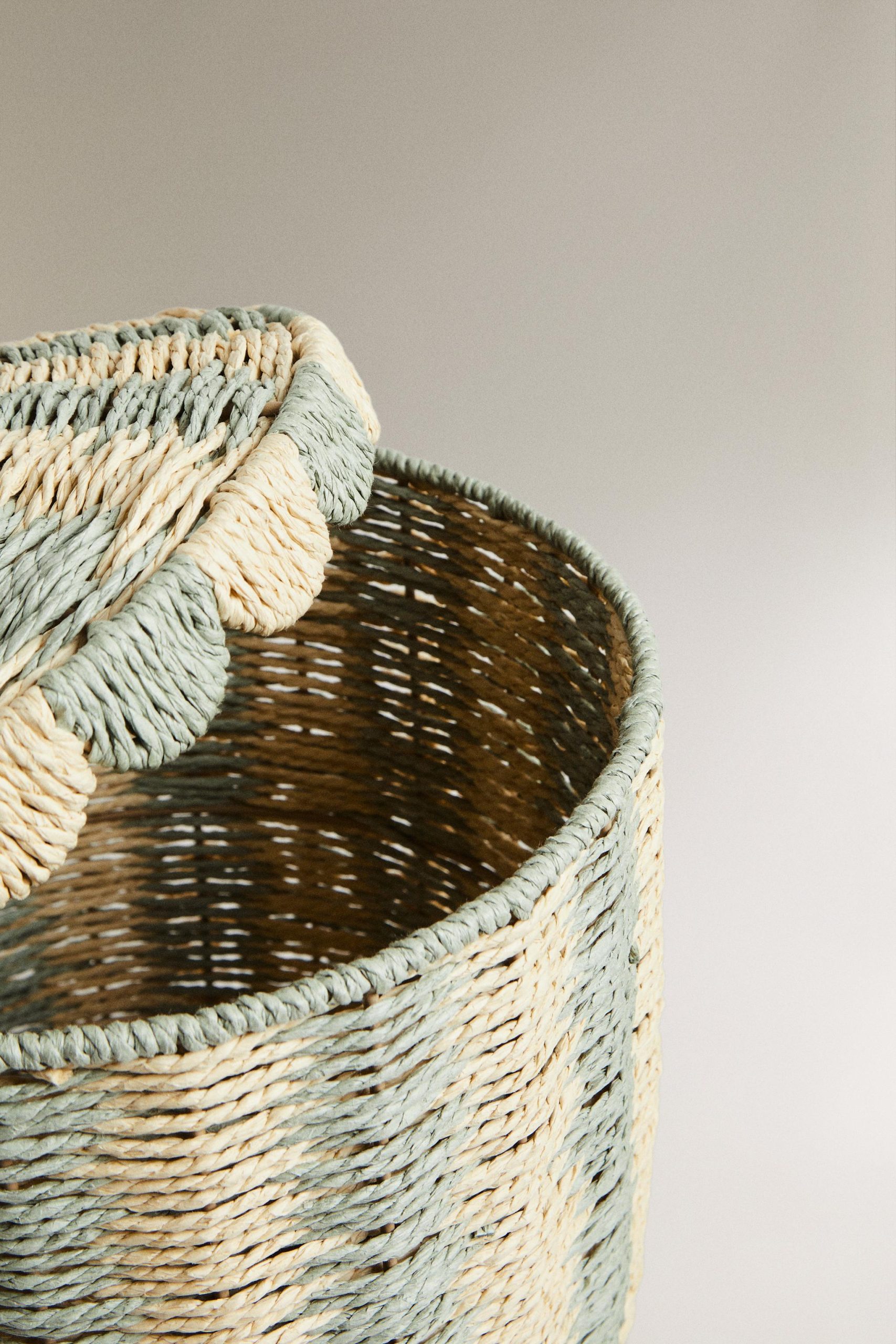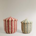 - Çocuklar için kapaklı oyuncak düzenlemek için kağıt örgü sepet. Sirk çadırını andıran çizgili tasarımlı.