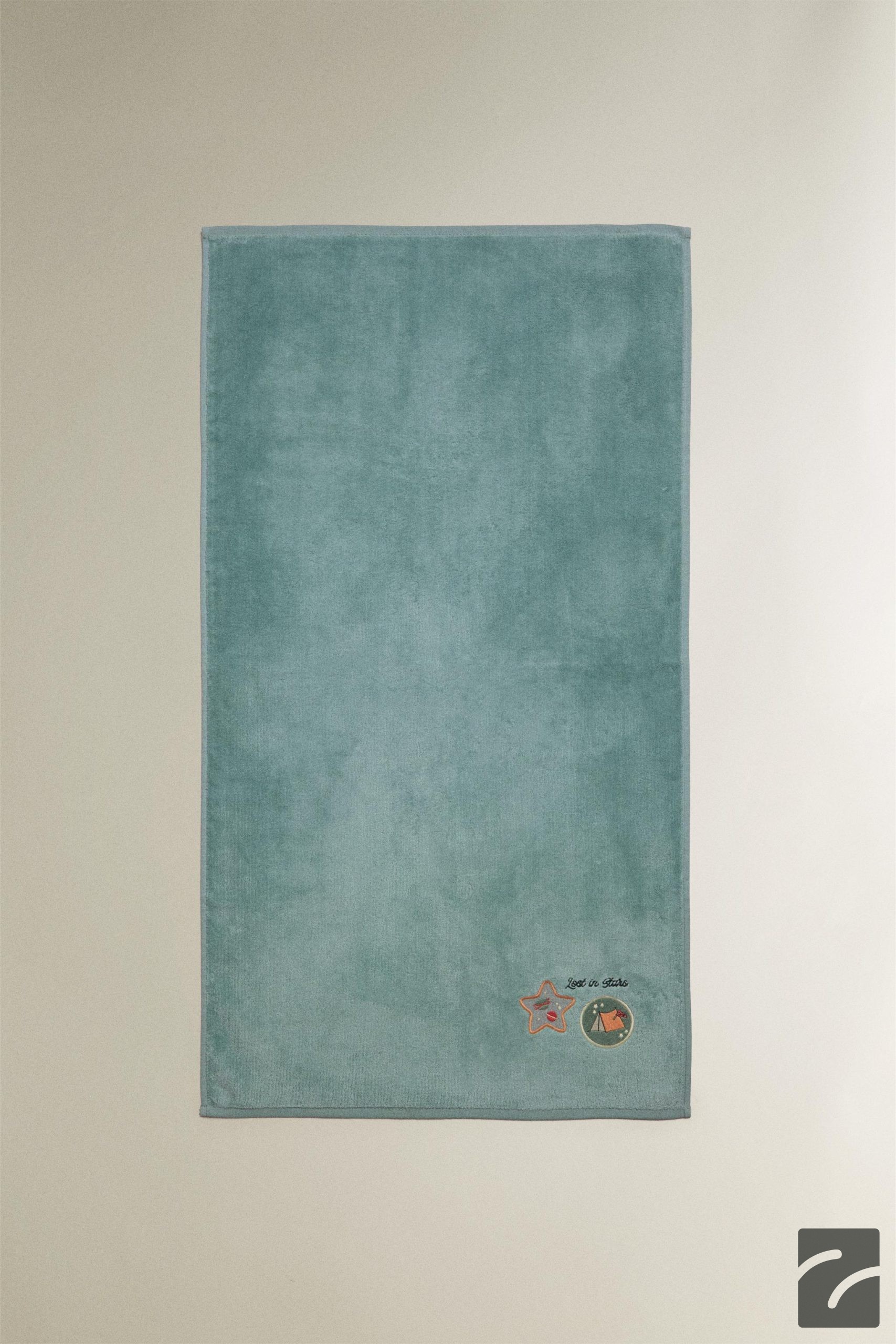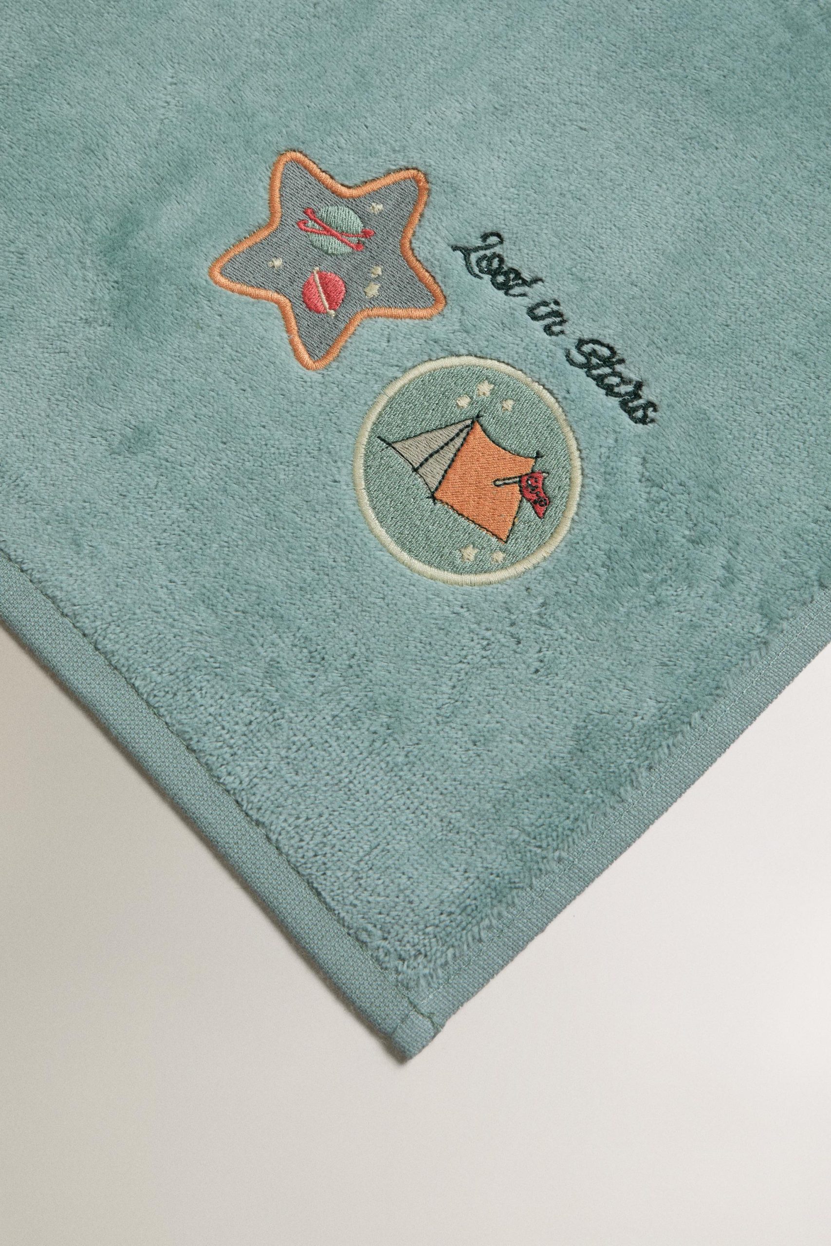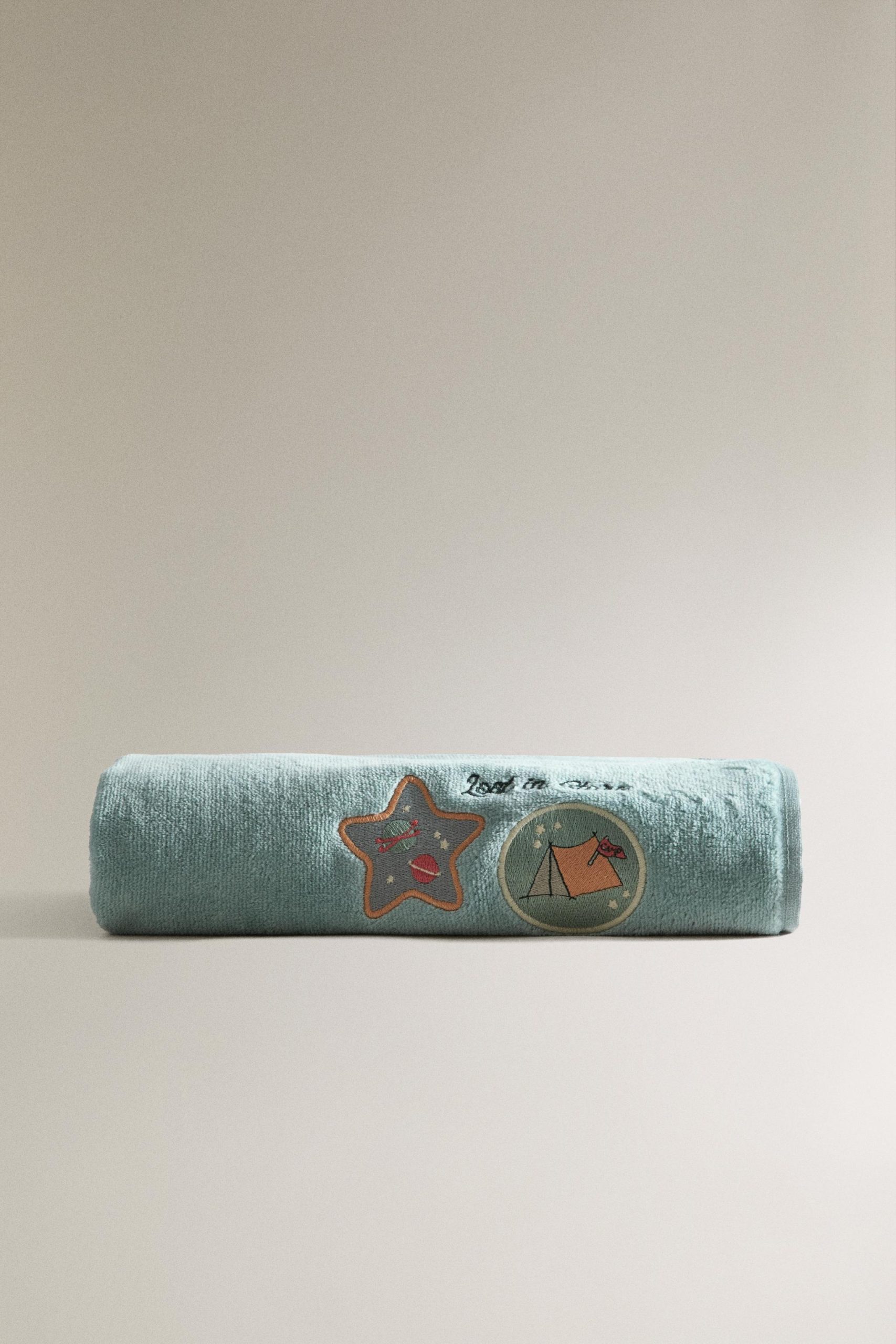 - Çocuklar için uzay esintili yama aplikeli, düz renkli, pamuklu velur çocuk havlusu.