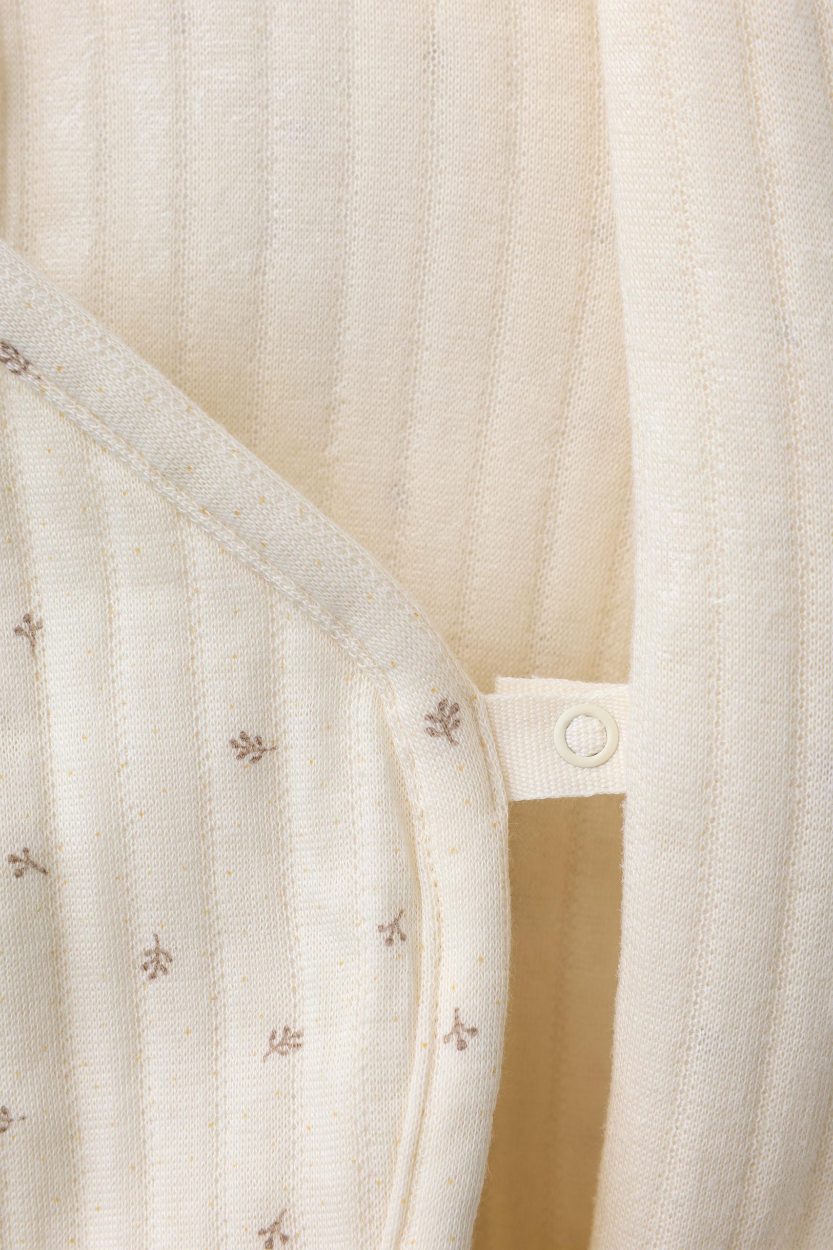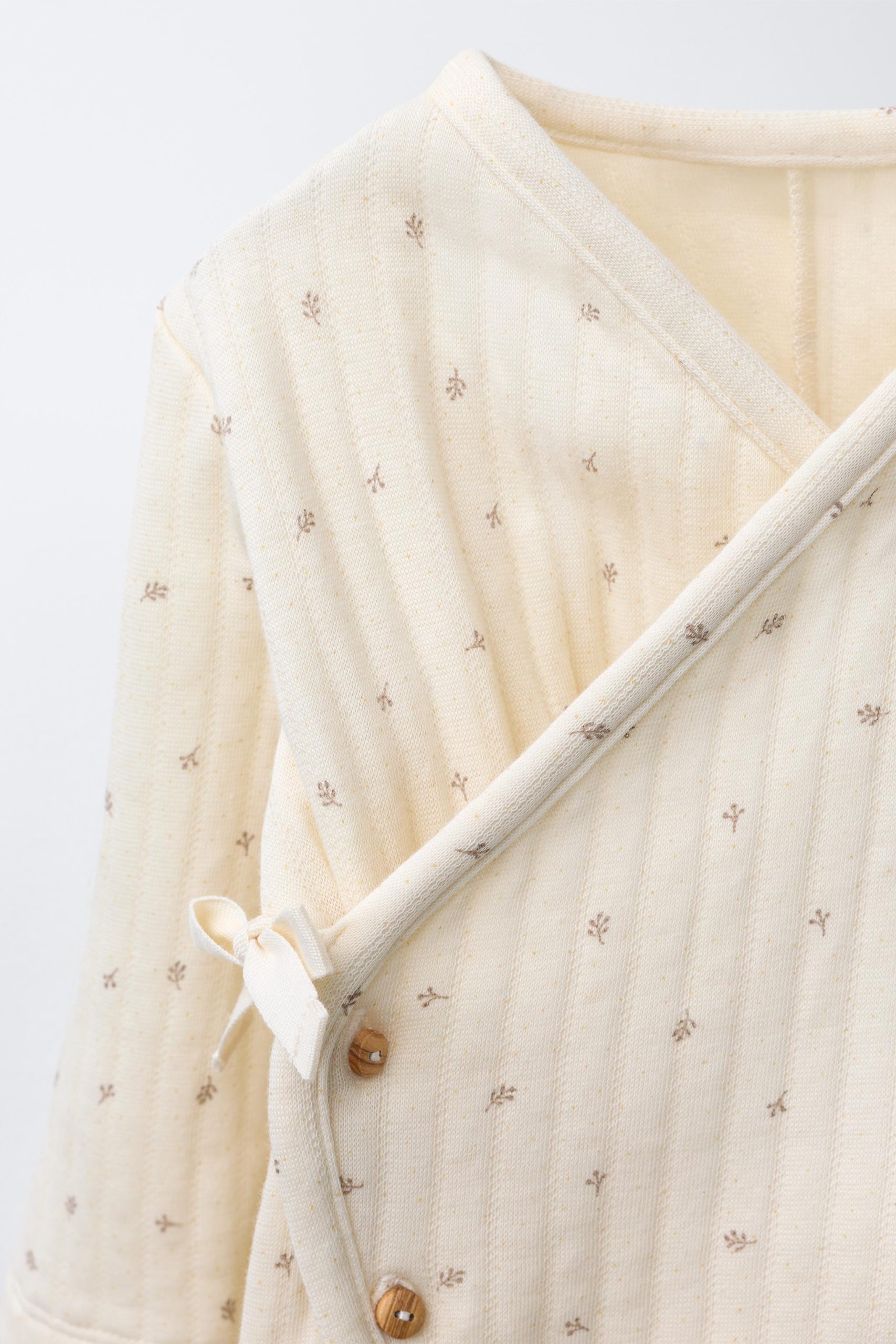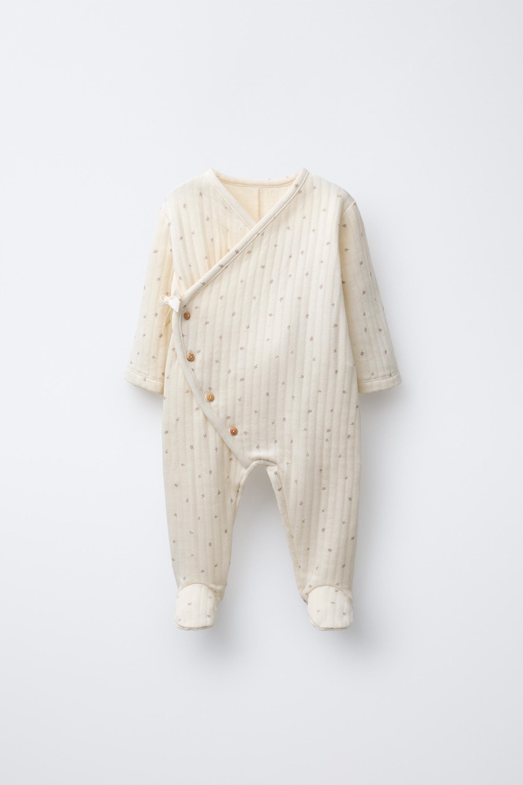 V yakalı, uzun kollu, kapitone tulum. Önden çapraz kapamalı, düğme kapamalı ve fiyonk aplikeli. Dal deseni baskılı.