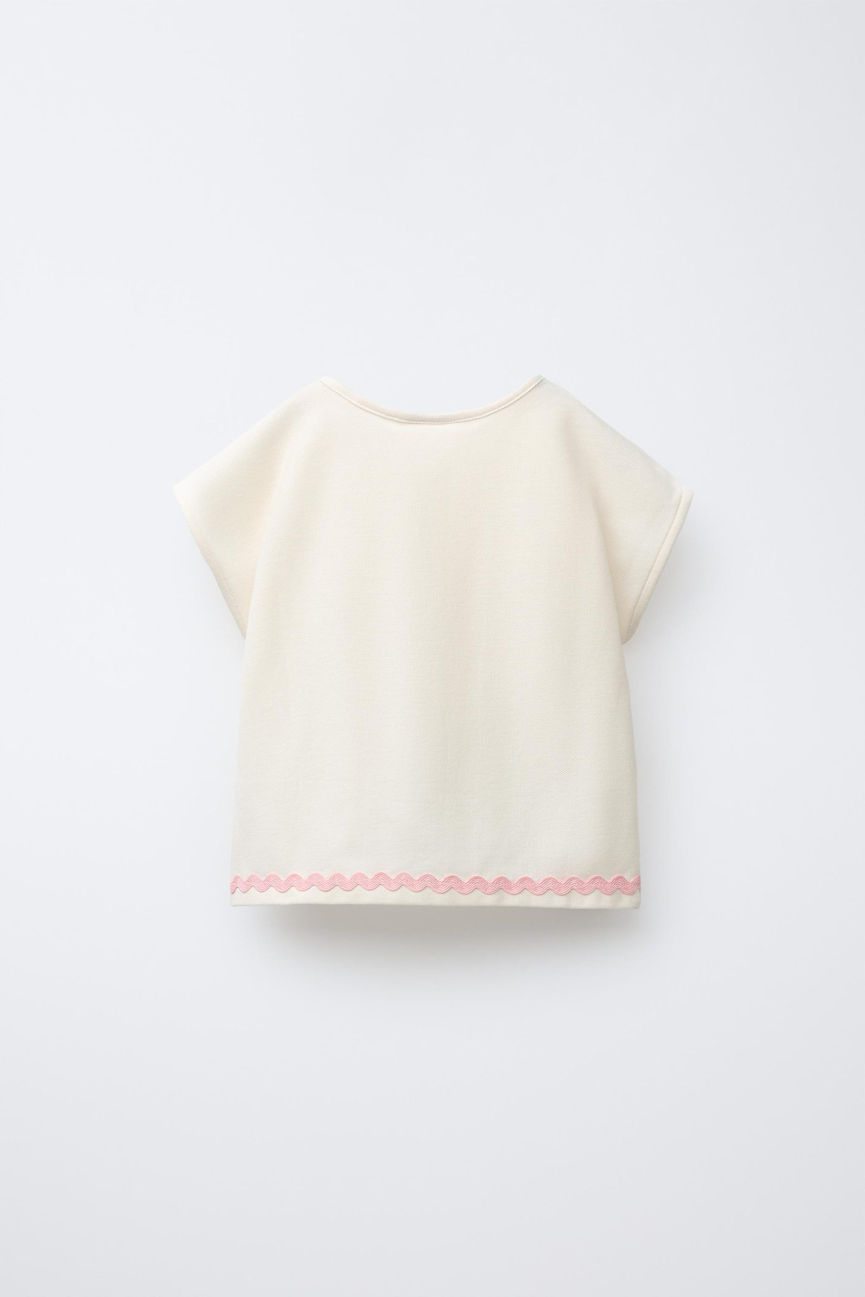 • Bisiklet yaka, kolsuz t-shirt. Etek ucunda kontrast renkli dalgalı aplikeli. %100 pamuklu kumaş.