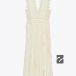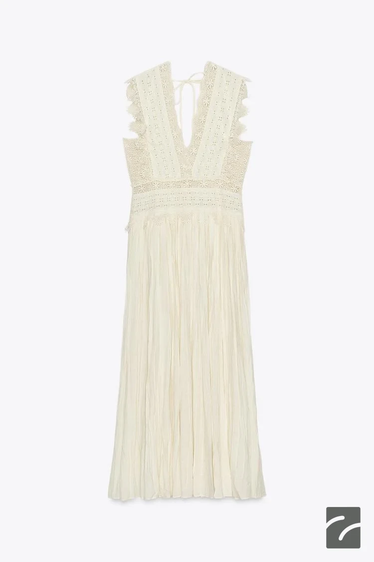 - Viskoz iplikten üretilmiş midi elbise. V yakalı, kolsuz. Dantel aplikeli ve kırışık kumaş detaylı. Sırtı açık, ayarlanabilir bağcıklı. Düz etek ucu.