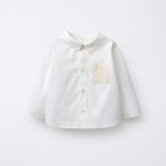 - Uzun kollu, bebe yaka gömlek. Önü düğme iliklemeli. Göğüste dantel kumaşlı yama cep.