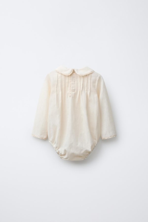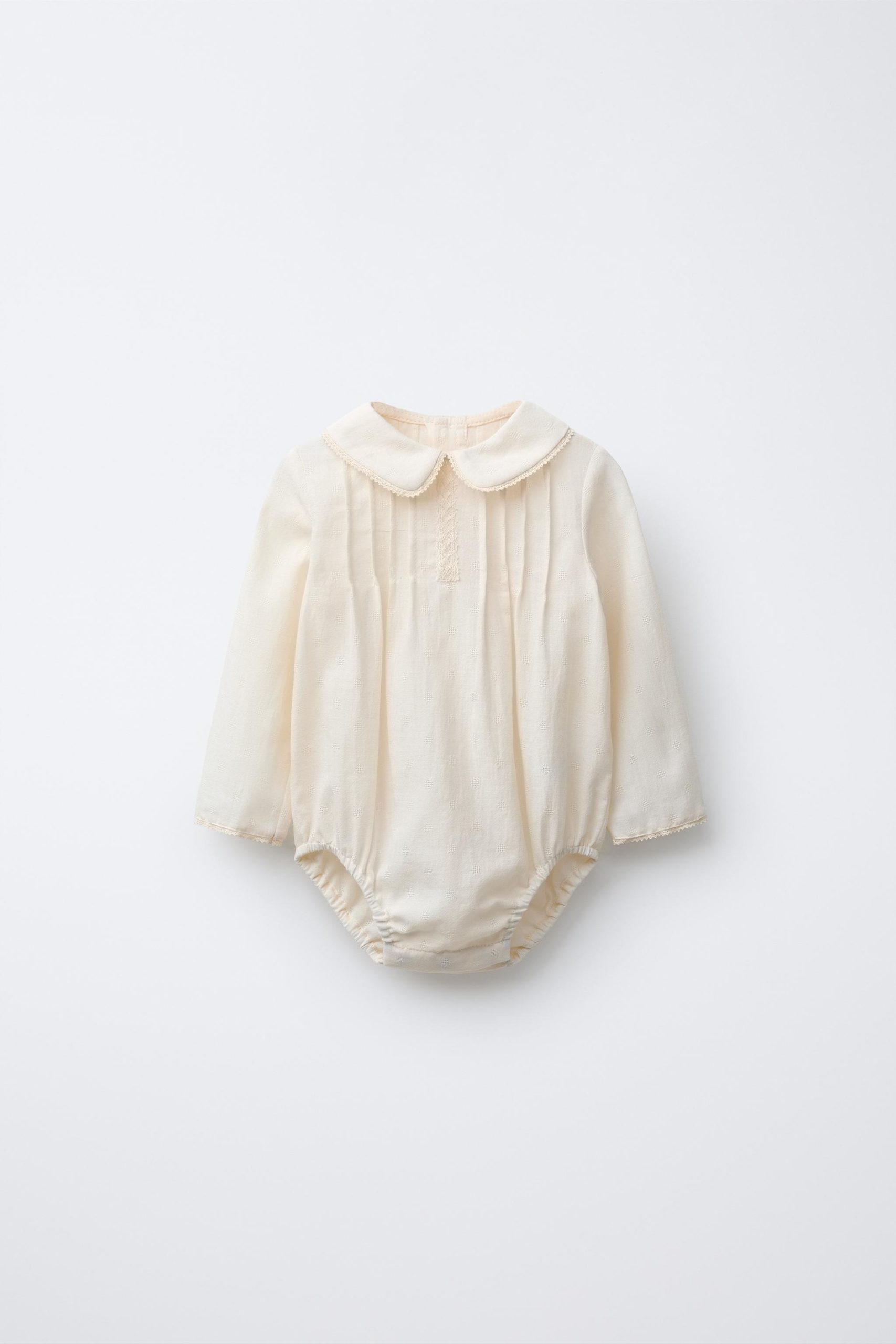 - Bebe yaka ve uzun kollu body. Dantel detaylı. Arkası düğmeli ve aşağıda gizli çıtçıtlı kapama. Göğüs kısmında büzgü detaylı.
