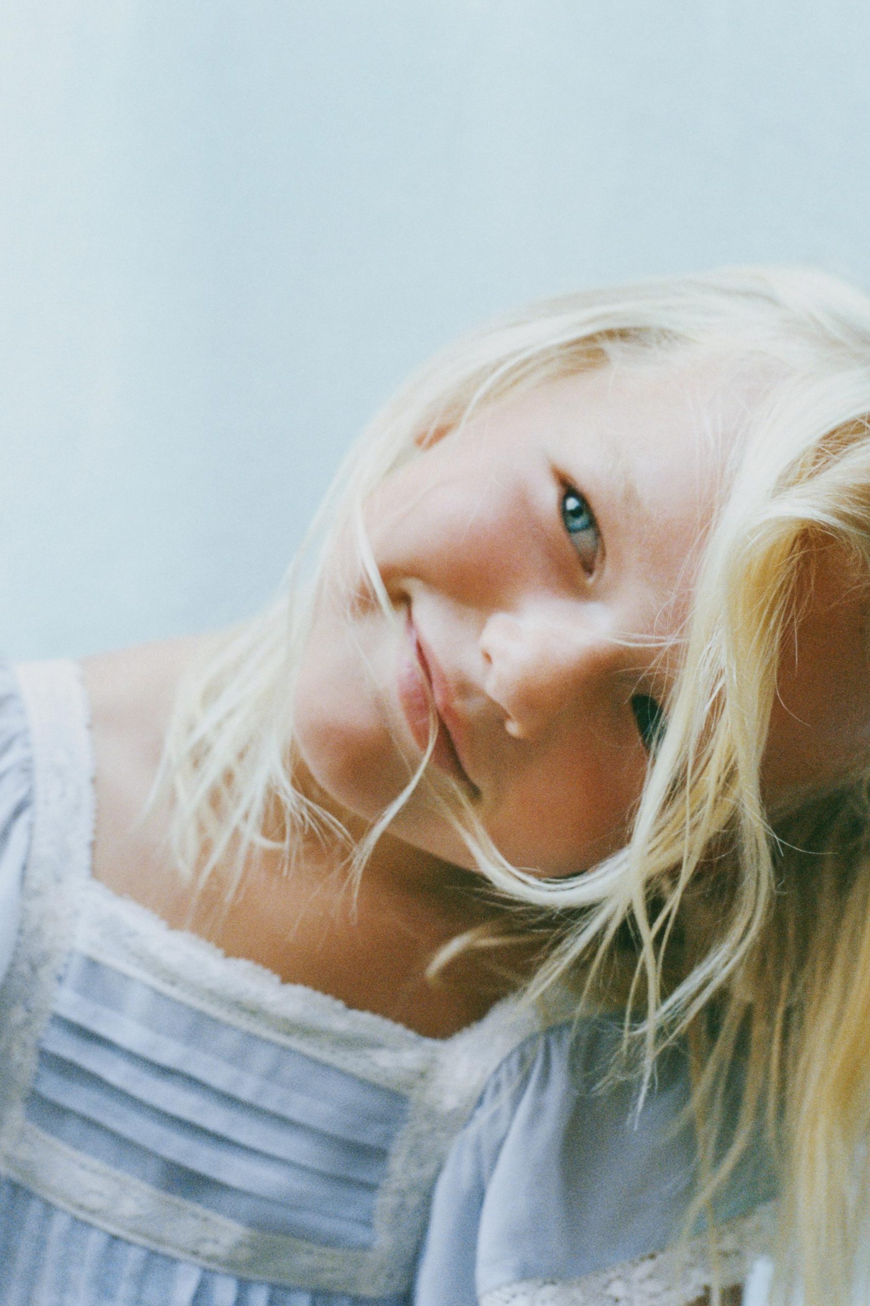 Düz yakalı, kısa kollu elbise. Önü pileli ve kontrast renkli dantel detaylı. Arkası düğmeli, yırtmaçlı.