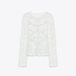 تیشرتی از پارچه دنتل با یقه دوچرخه‌ای و آستین‌های بلند. دارای جزئیات گلدوزی شده به صورت تن‌به‌تن.