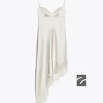 این میدیدست لباس از پارچه ساتن تولید شده است. دارای یقه قلبی و بندهای نازک قابل تنظیم است. قسمت پشت باز و دارای جزئیات بند قابل تنظیم است. لبه دامن به صورت نامتقارن طراحی شده و با جزئیات دانتل هماهنگ رنگی ترکیب شده است.