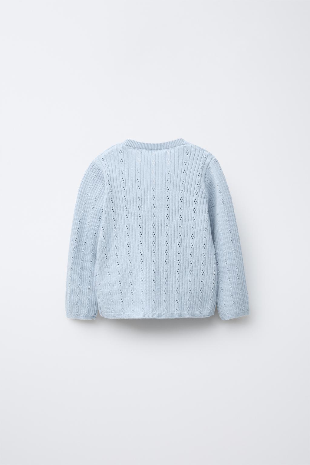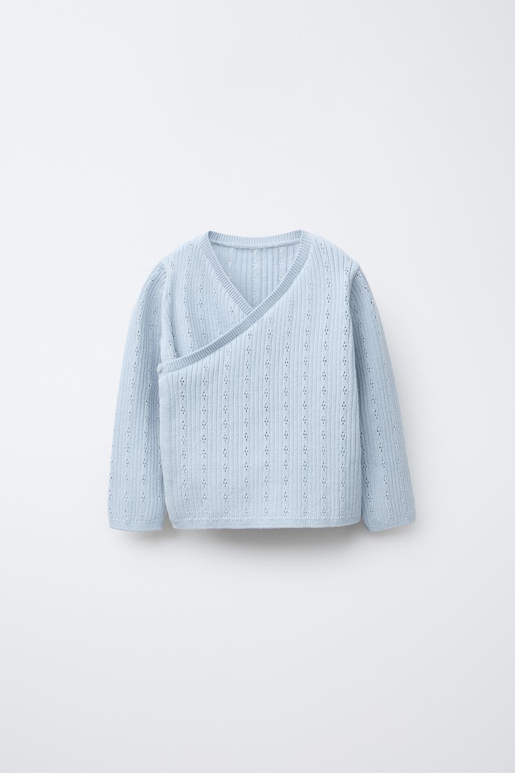 V yaka, uzun kollu, önü kruvaze, yandan ve içten düğme kapamalı, ajurlu detaylı triko hırka.