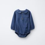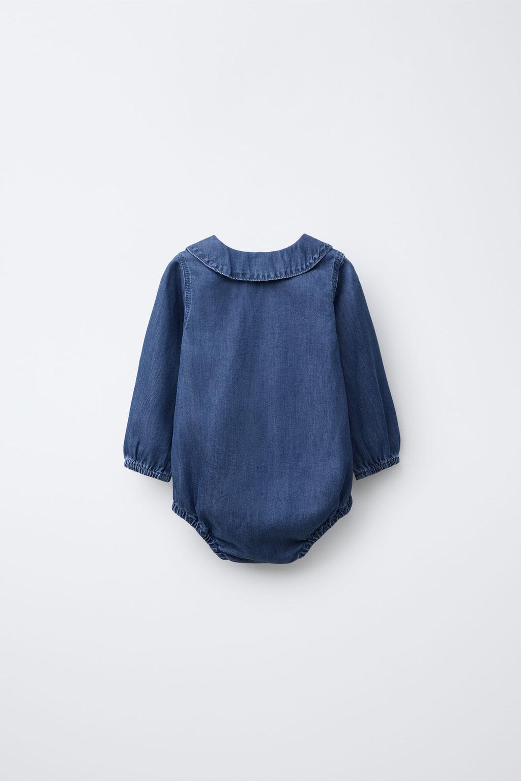- Bebe yakalı ve lastikli uzun kollu denim body. Robadan düğme ve alt kısımda çıtçıt kapamalı. Göğüste yama cep detaylı.
