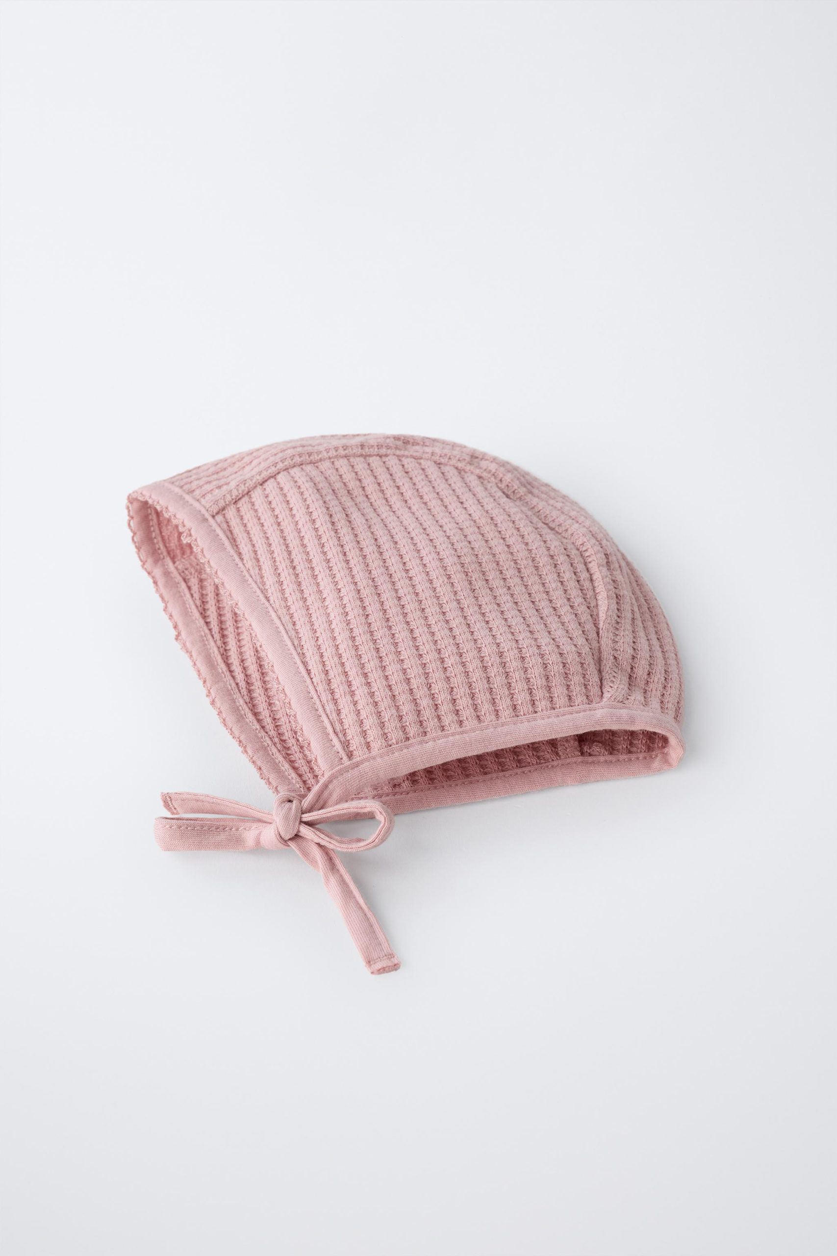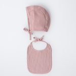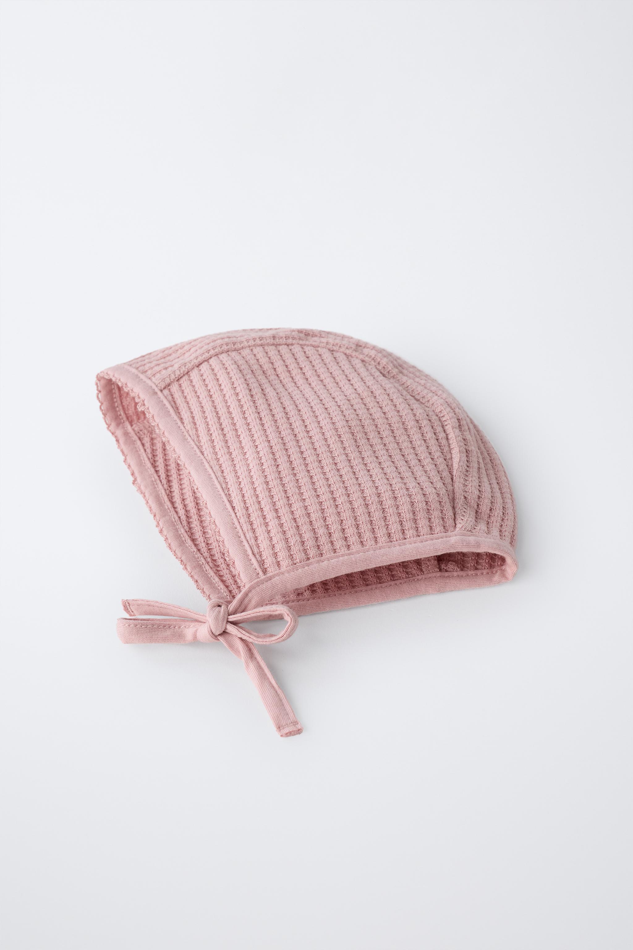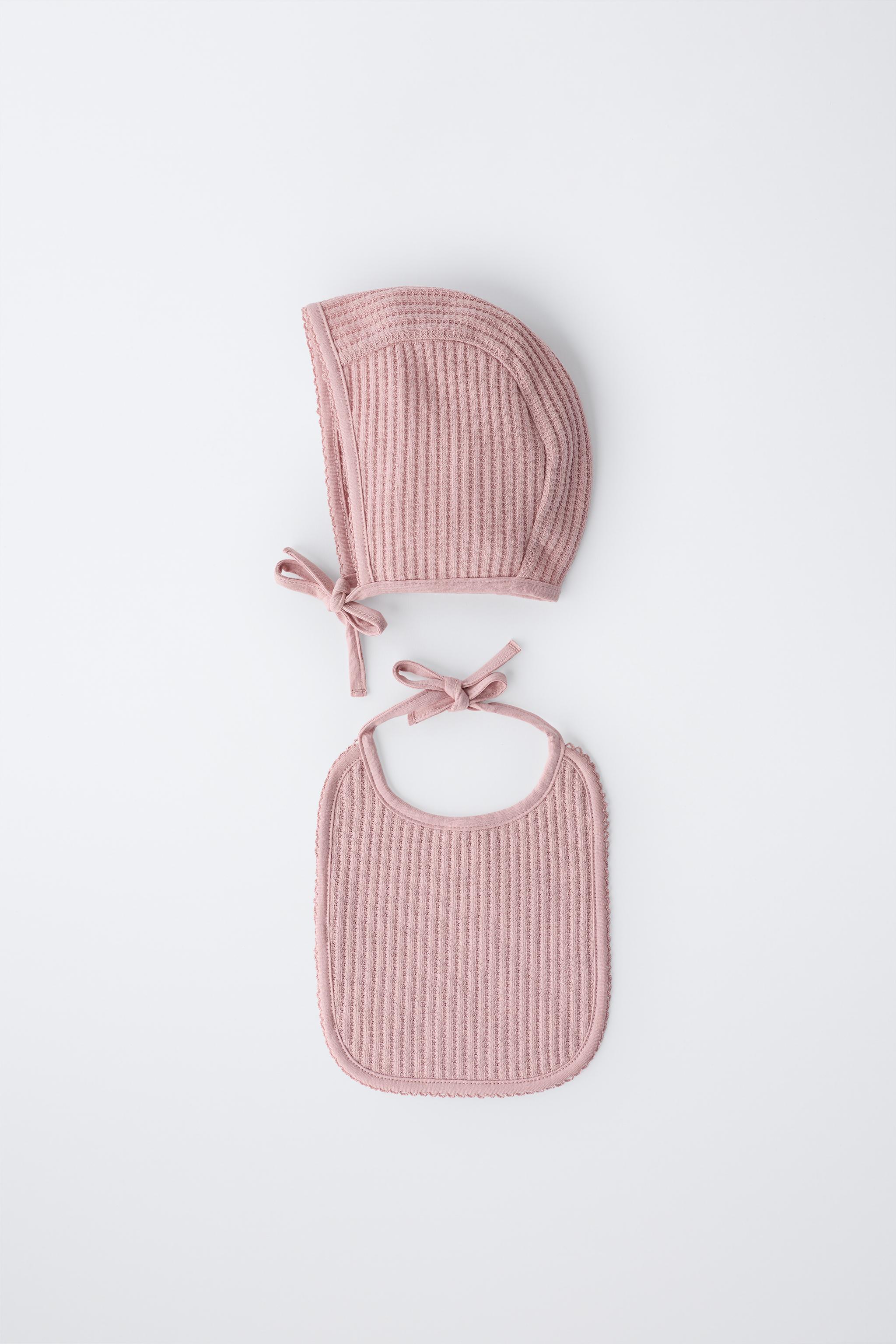 ست دو تکه. کلاه با بند قابل تنظیم در جلو. پیشبند با بند قابل تنظیم در قسمت گردن. لبههای موجدار. جزئیات بافتی.