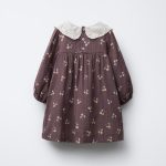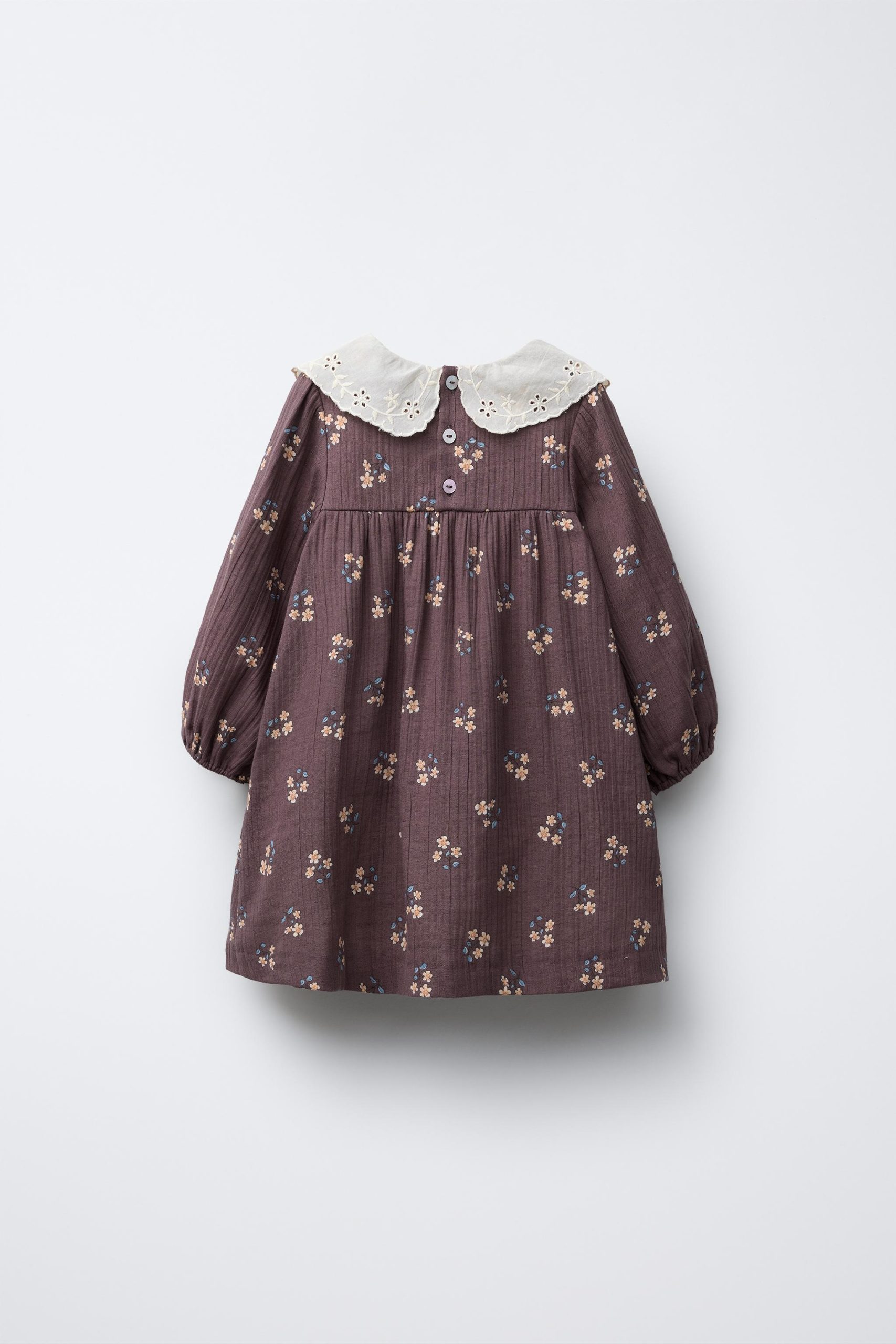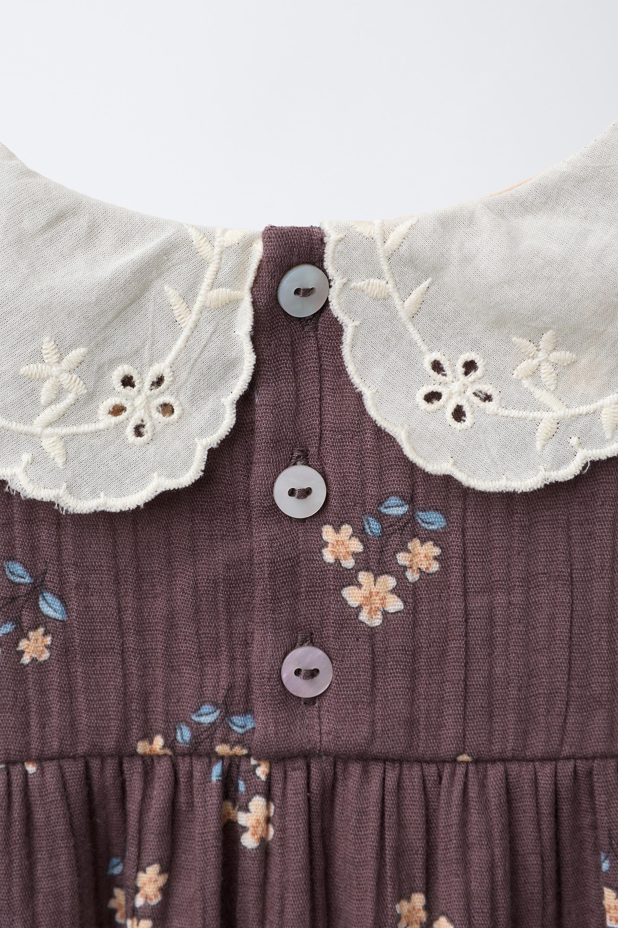 - Bebe yakalı, işlemeli detaylı, lastik manşetli uzun kollu elbise. Arkadan düğmeli. İç astarlı. Çiçek desenli.