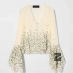 بلوز نیمه شفاف با 100% الیاف ابریشم، دارای یقه V و آستینهای بلند با طراحی چیندار. این بلوز با جزئیات چاپی گلدار و دکمههای جلو طراحی شده است.