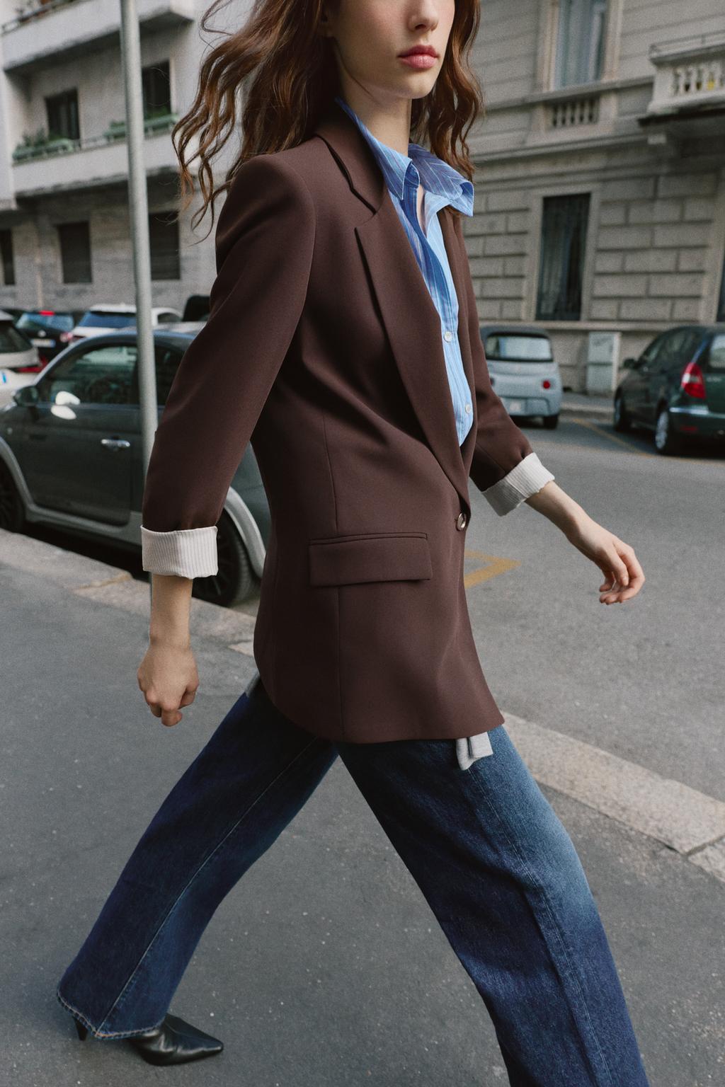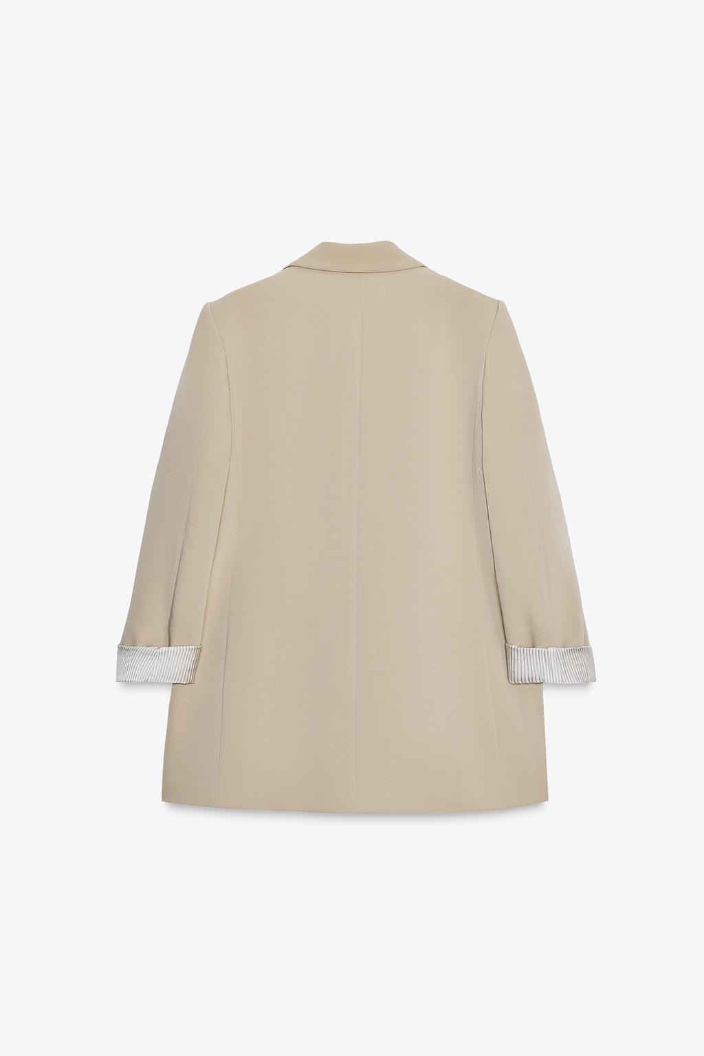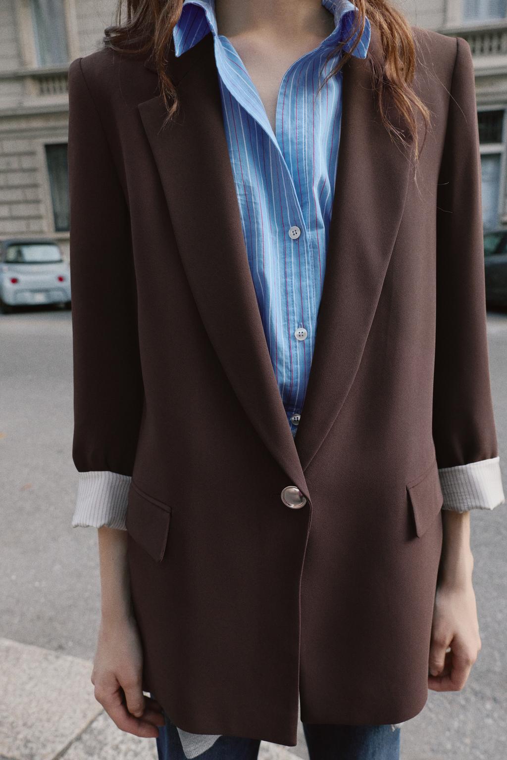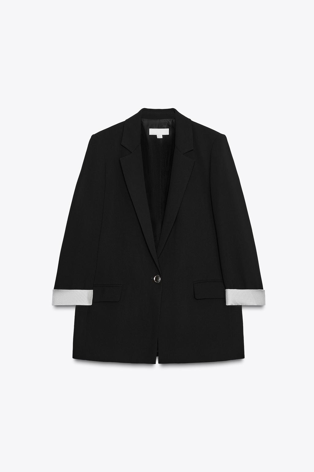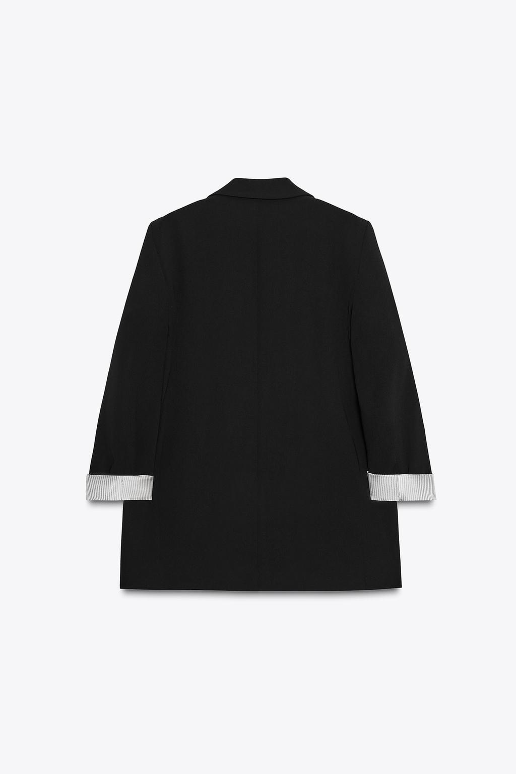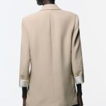 - Katlı yaka, kabarık omuzlu, manşetleri desenli çevirmeli, uzun kollu blazer. Kapaklı ön cepli. Tek düğmeli ön kapatmalı.