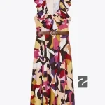 V yaka, fırfırlı ve büzgülü elbise. Kolsuz ve kemerli. Yan dikişte gizli fermuarlı.
